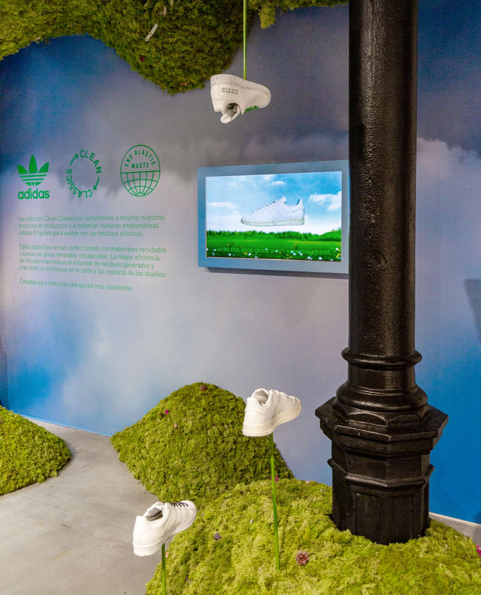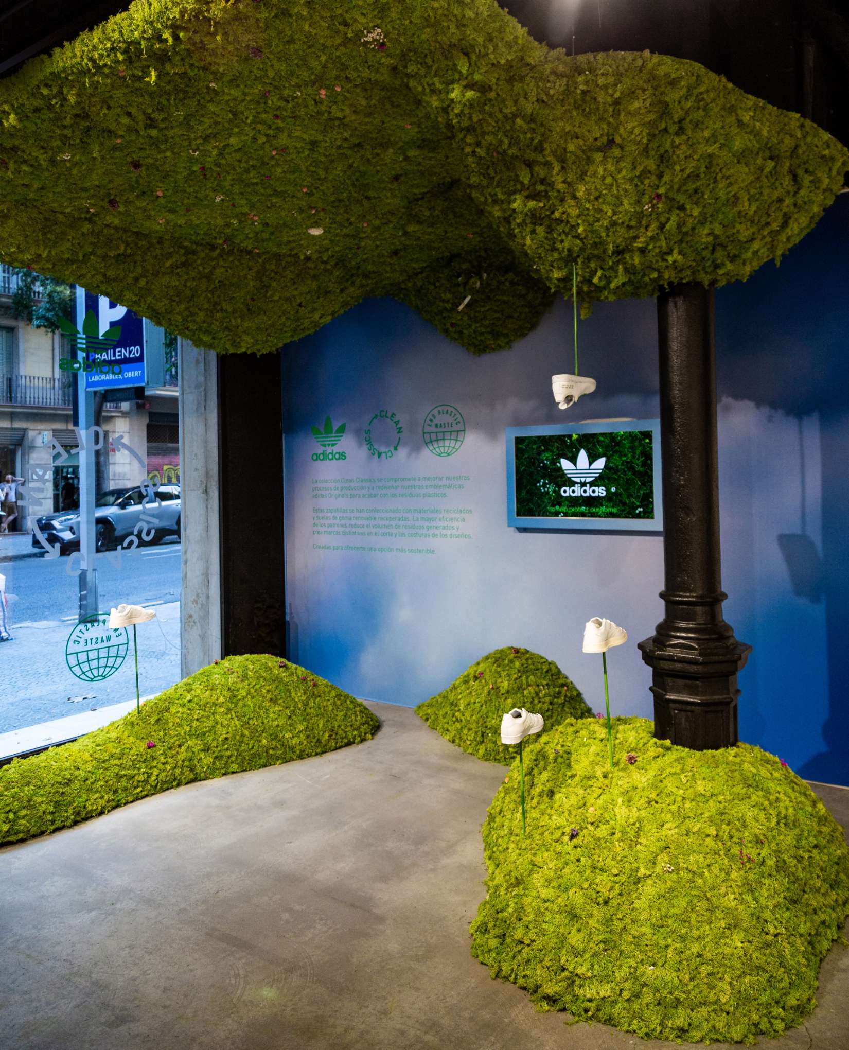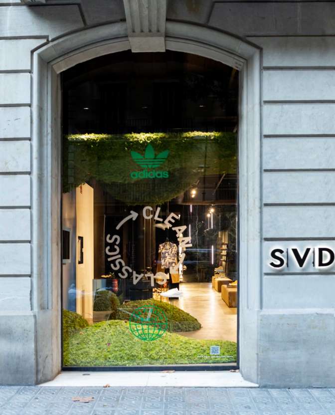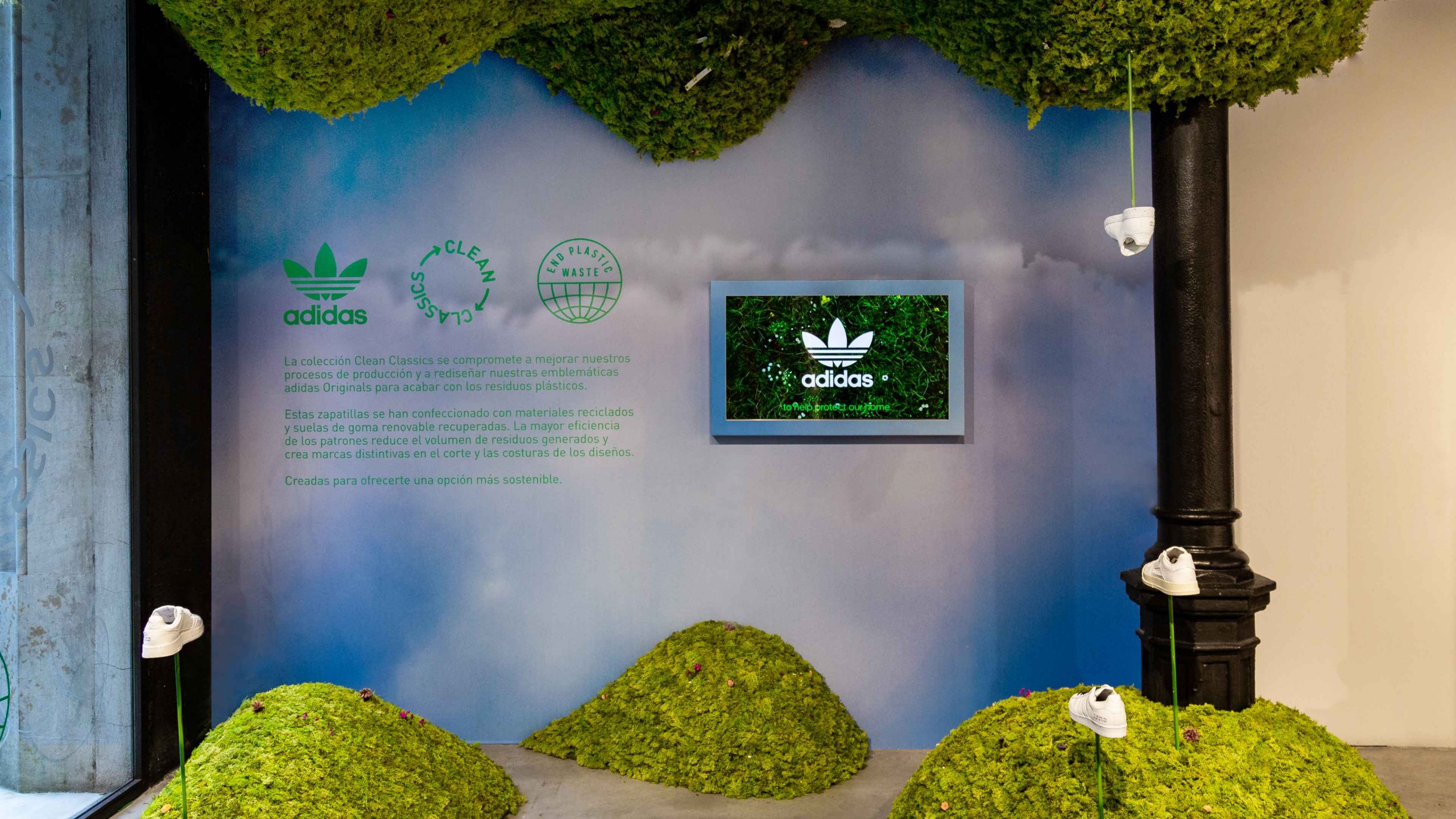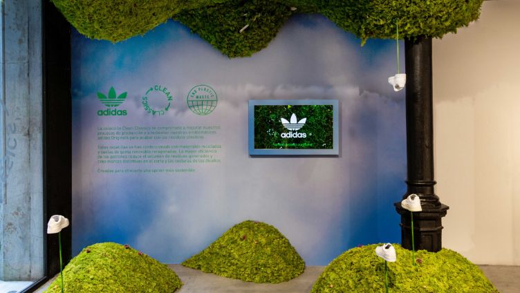 Creamos un escaparate que sea símbolo de innovación, progreso y compromiso con el medio ambiente. Desarrollamos un concepto que fusiona la naturaleza con las zapatillas fabricadas con materiales reciclados, proporcionando un espacio fresco en el que invita al usuario a entrar y descubrir los nuevos modelos de adidas.