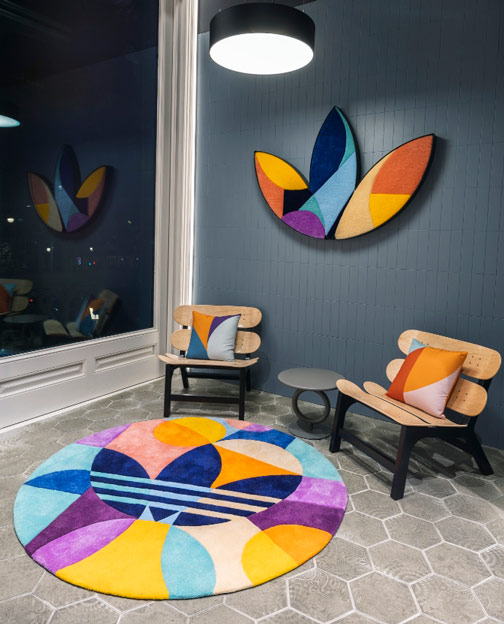 Para la zona Originals diseñamos una tapiz, una alfombra y distintos skates hechos a mano con un lenguaje visual lleno de geometría y color. Un espacio en el que descansar, conversar y disfrutar.