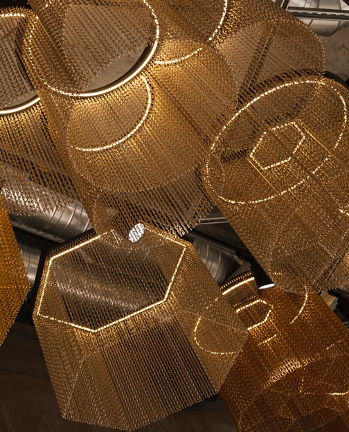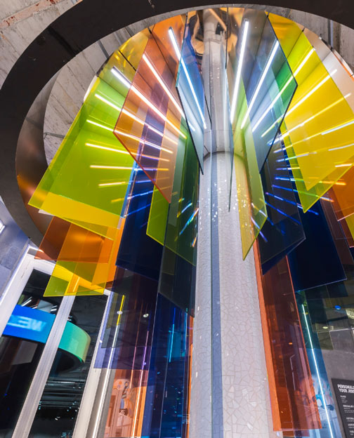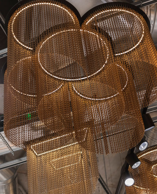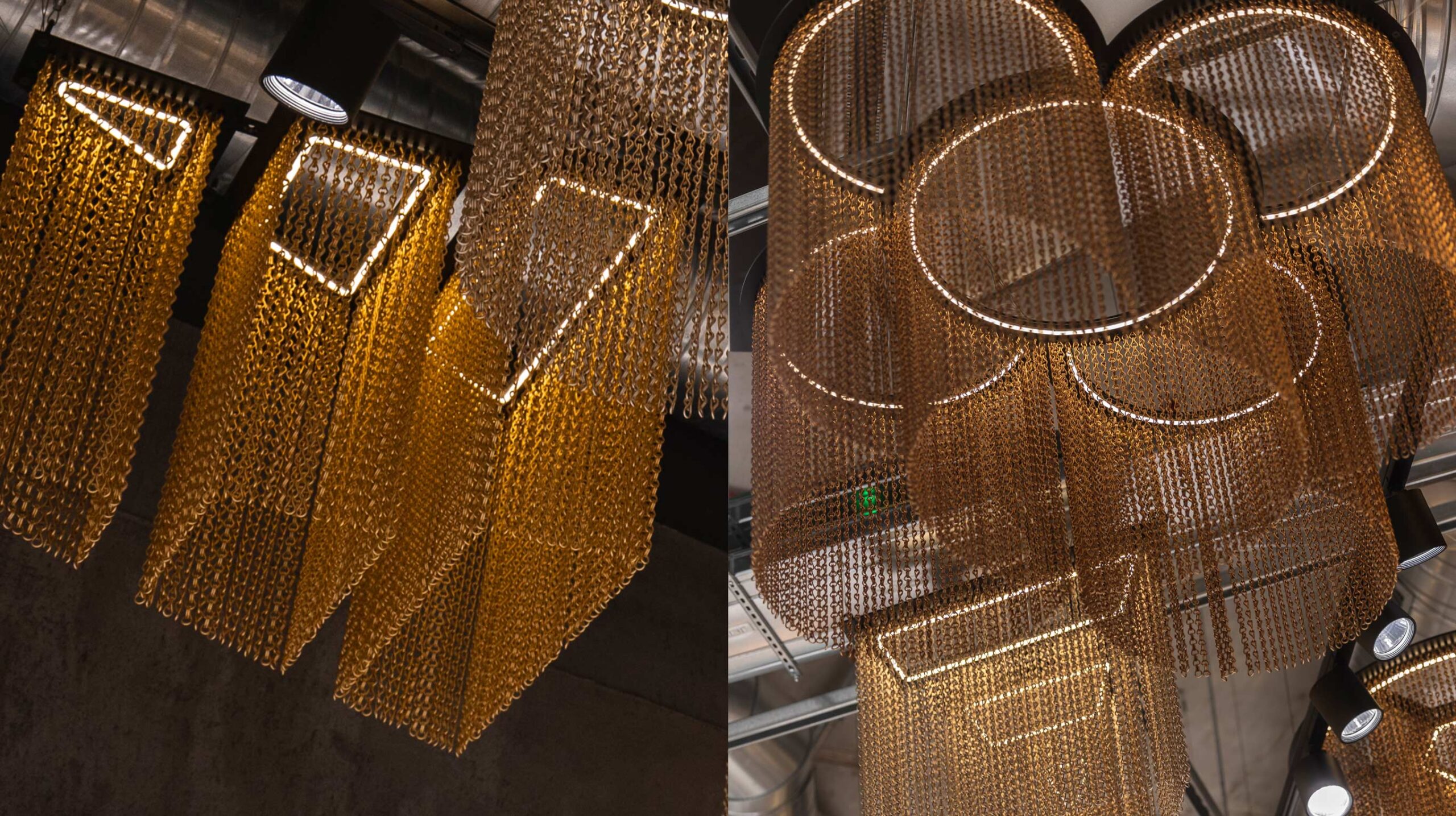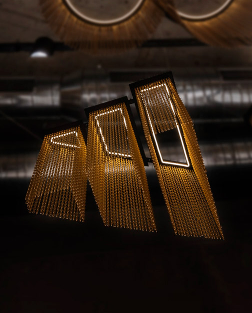 Para conectar ambas plantas revestimos la columna con el icónico trencadís. Jugamos con la escala del espacio creando un chandelier que evoca los efectos de la luz en las distintas vidrieras de la ciudad.