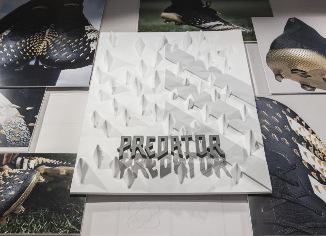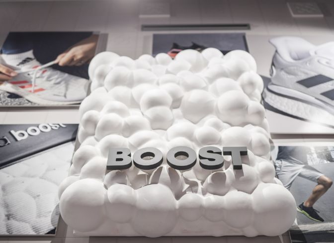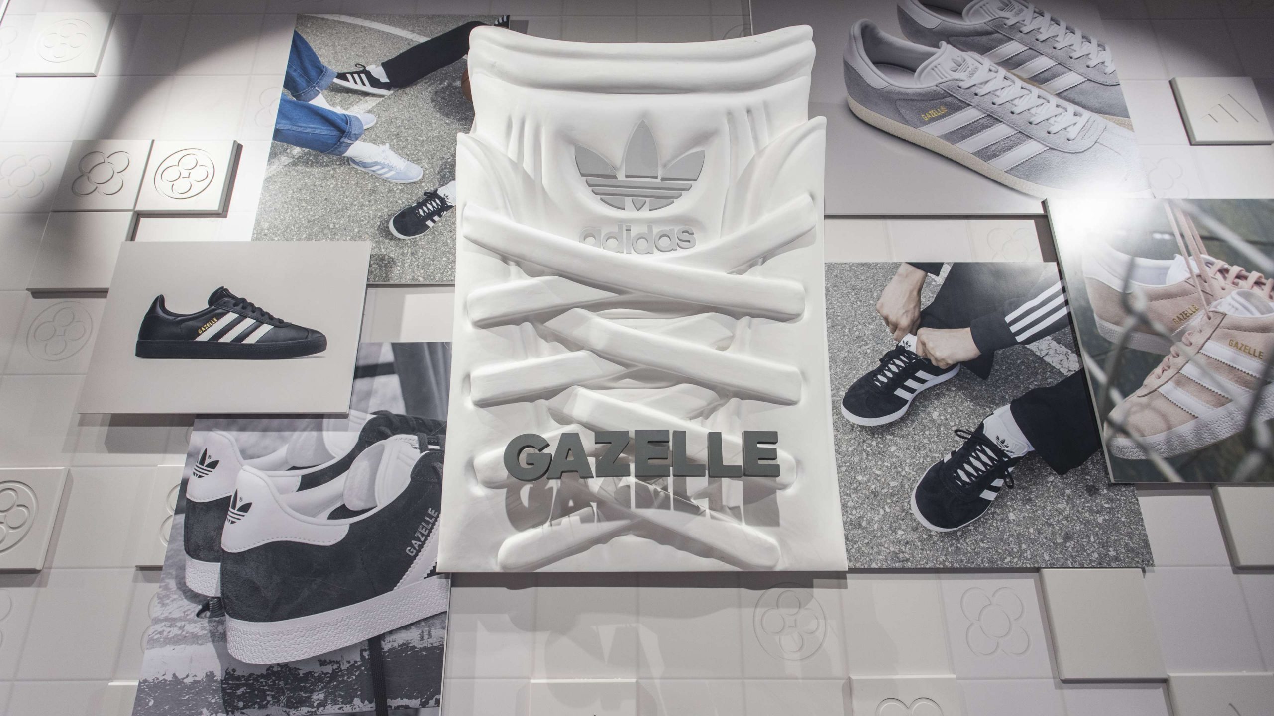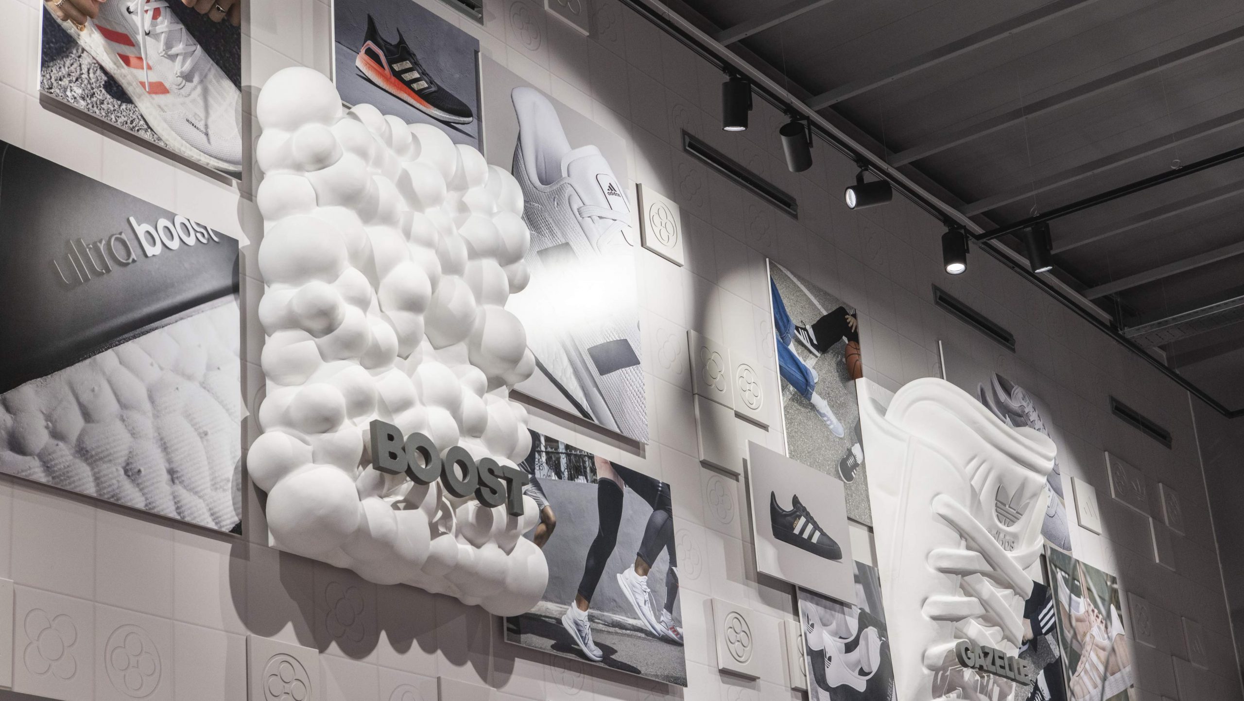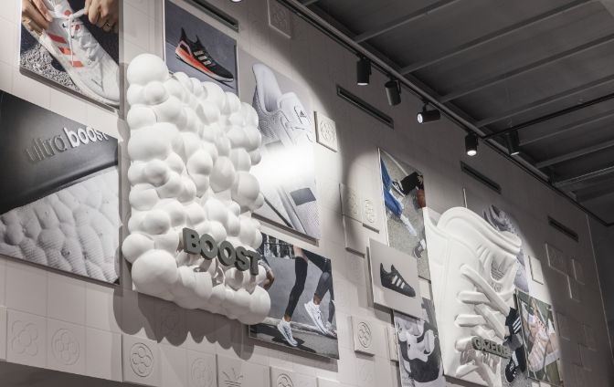 Actuamos en distintas zonas como el friso, los probadores, la caja y la pared de salida. Generamos un fondo en tonos neutros con sutiles referencias gráficas a la ciudad de Barcelona y a la marca, combinando texturas impresas con elementos en relieve. Sobre este fondo creamos diferentes soportes en los que poder dar protagonismo a las siluetas más icónicas de adidas como son Superstar, Predator, Gazelle o la tecnología Boost.