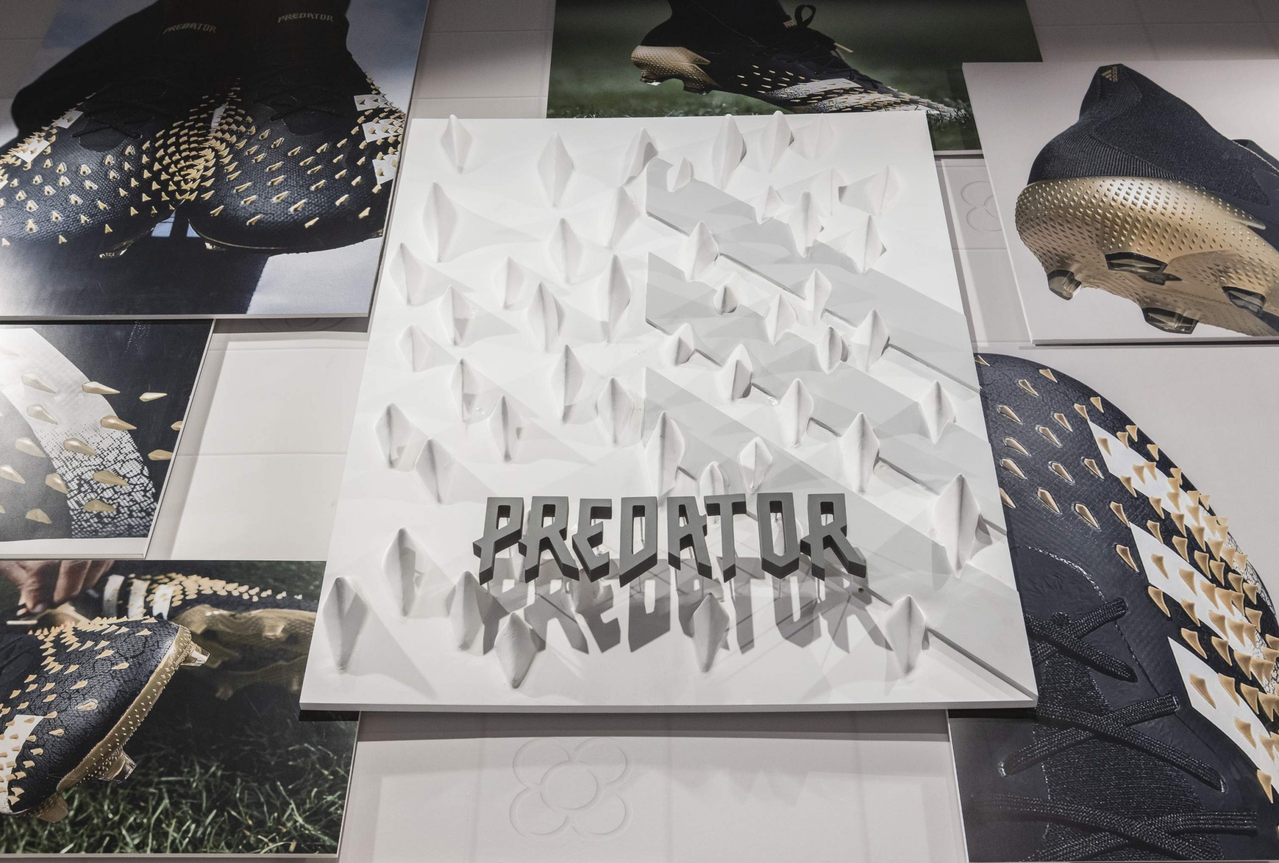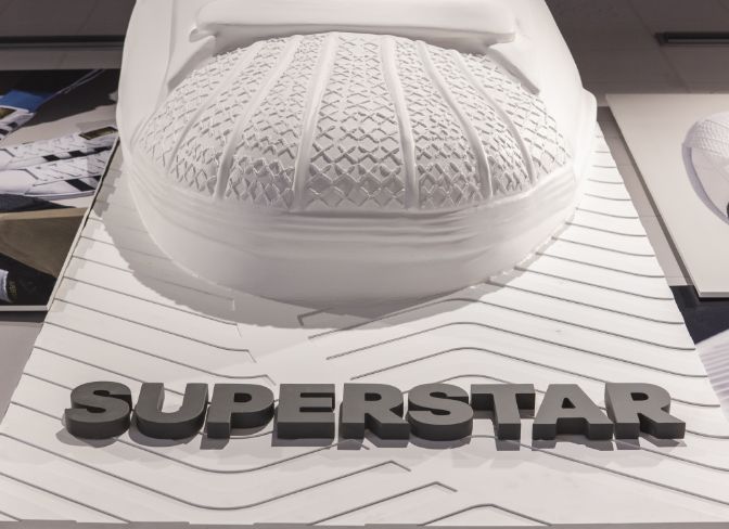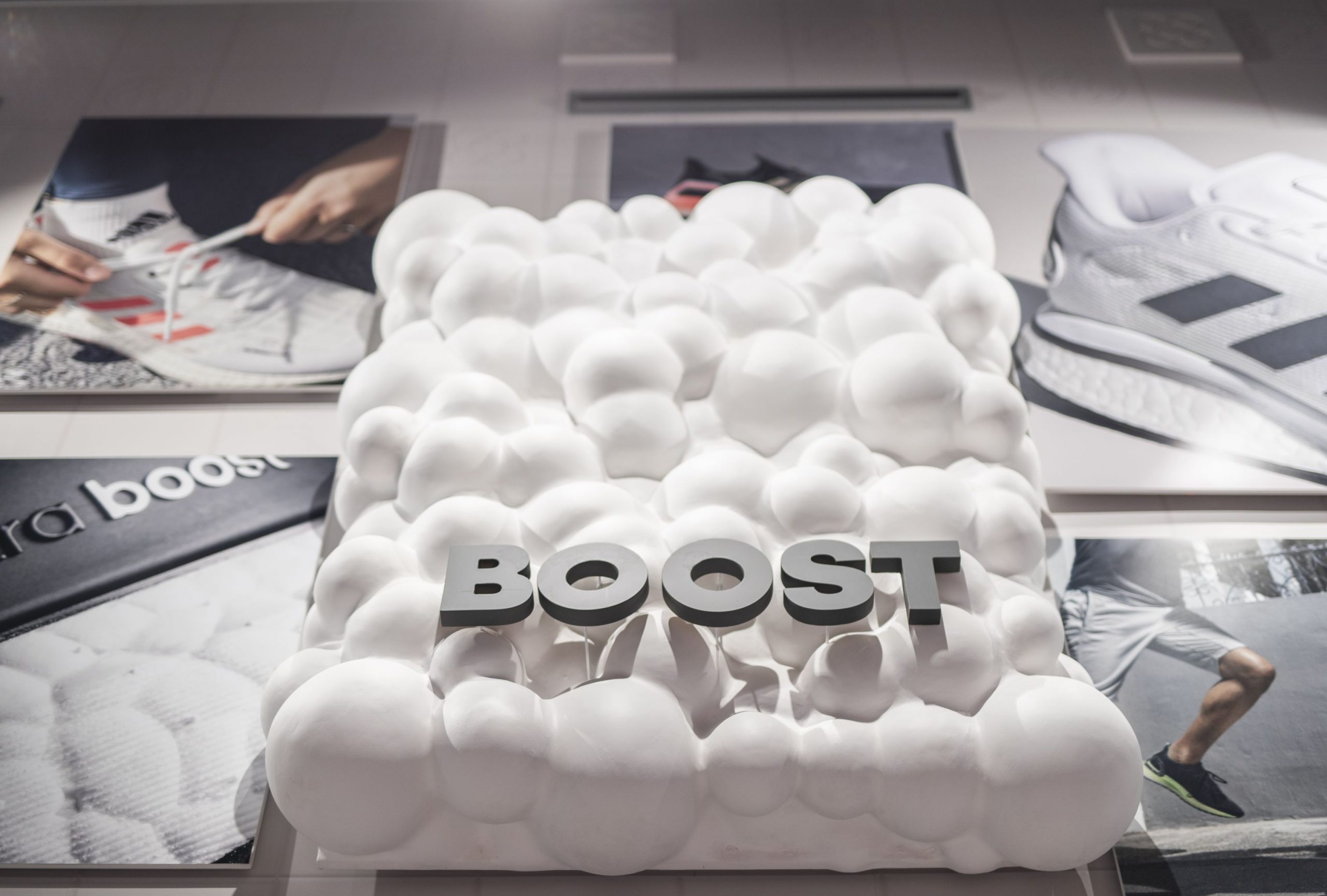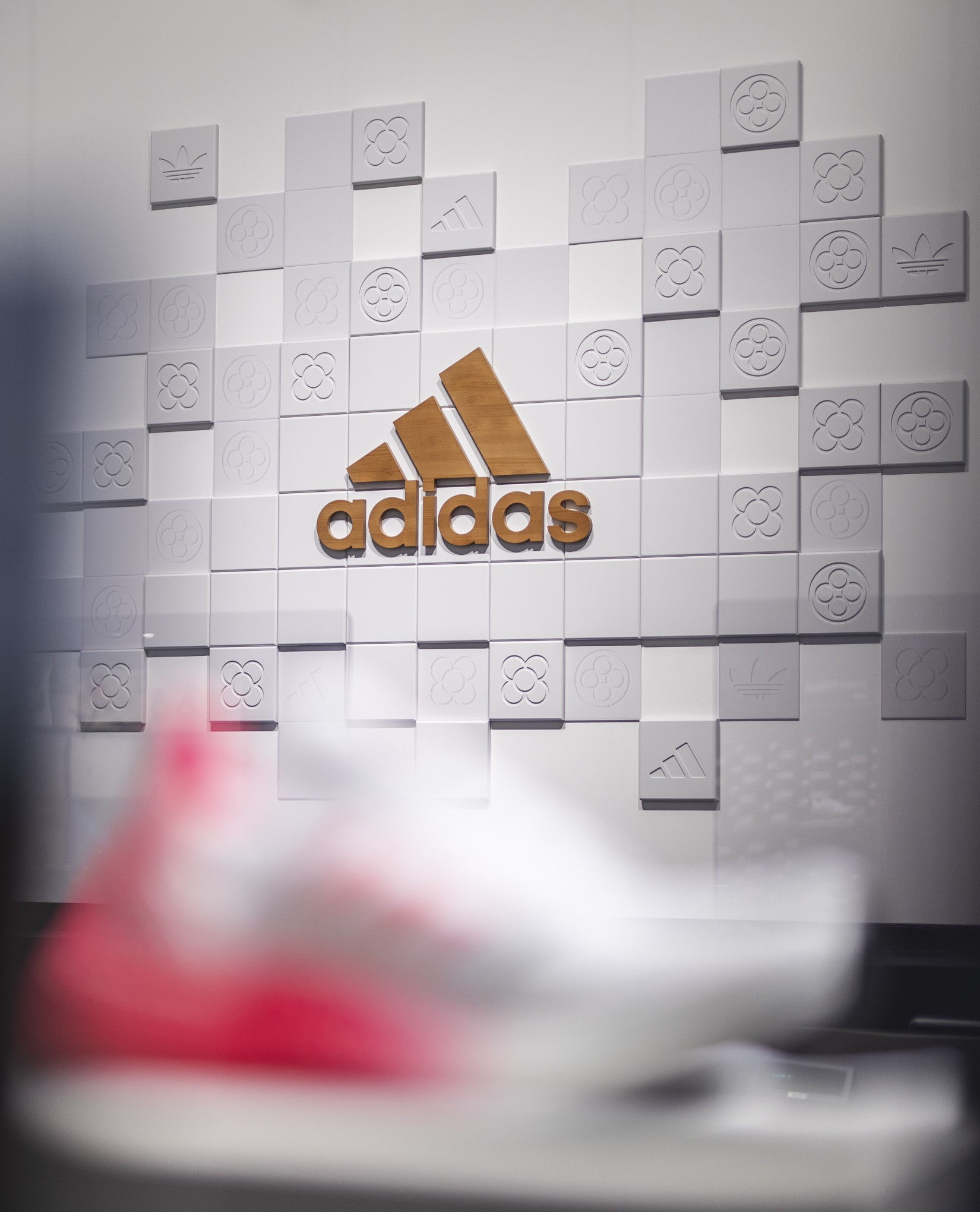 Actuamos en distintas zonas como el friso, los probadores, la caja y la pared de salida. Generamos un fondo en tonos neutros con sutiles referencias gráficas a la ciudad de Barcelona y a la marca, combinando texturas impresas con elementos en relieve. Sobre este fondo creamos diferentes soportes en los que poder dar protagonismo a las siluetas más icónicas de adidas como son Superstar, Predator, Gazelle o la tecnología Boost.