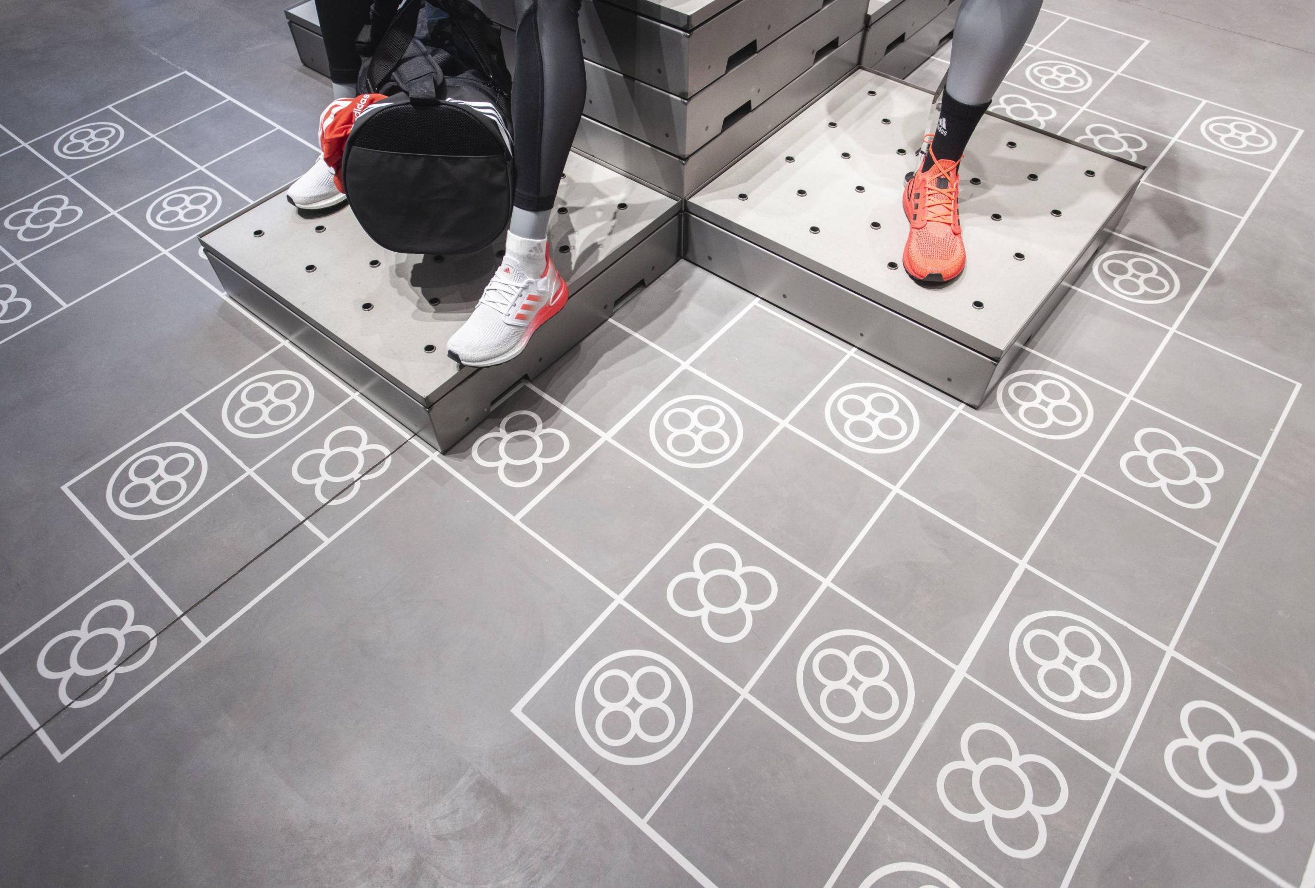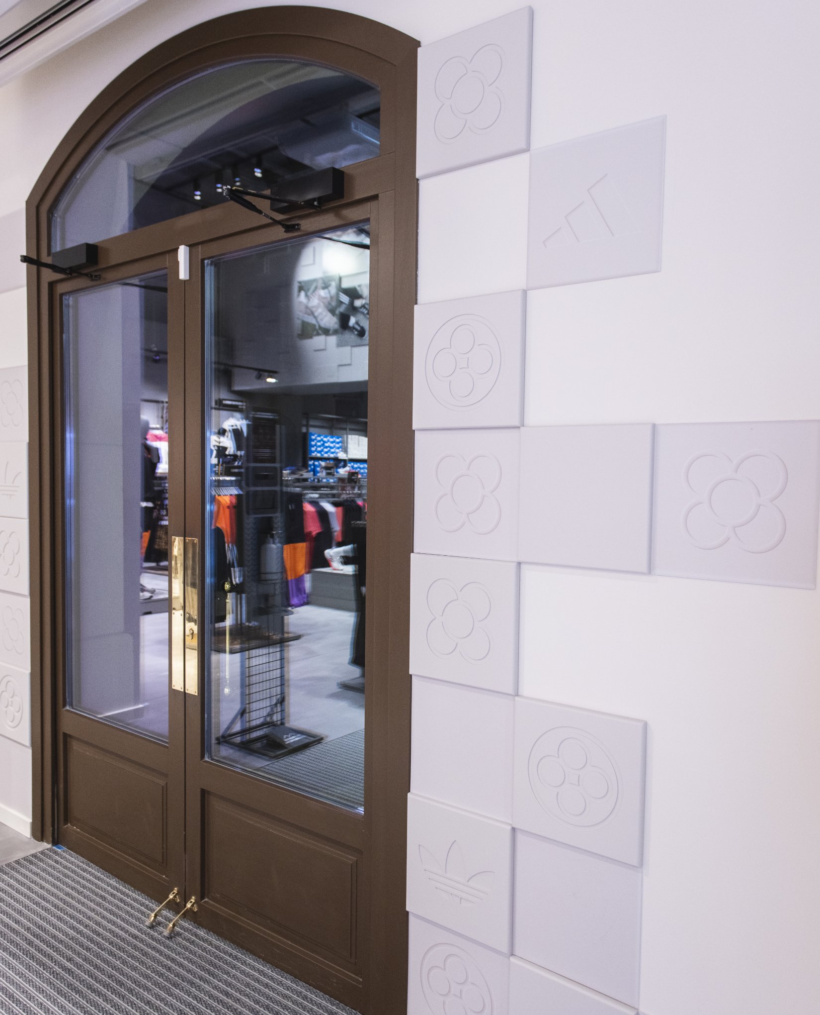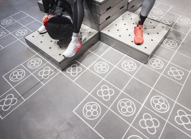 Diseñamos una serie de baldosas con elementos gráficos que hacían referencia a adidas y Barcelona. Un hilo conductor que aplicamos a distintas zonas como la caja o la salida para conseguir una consistencia visual en el espacio.
