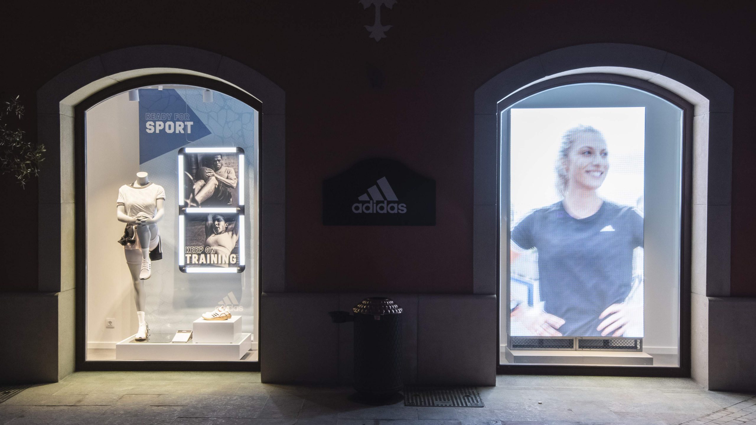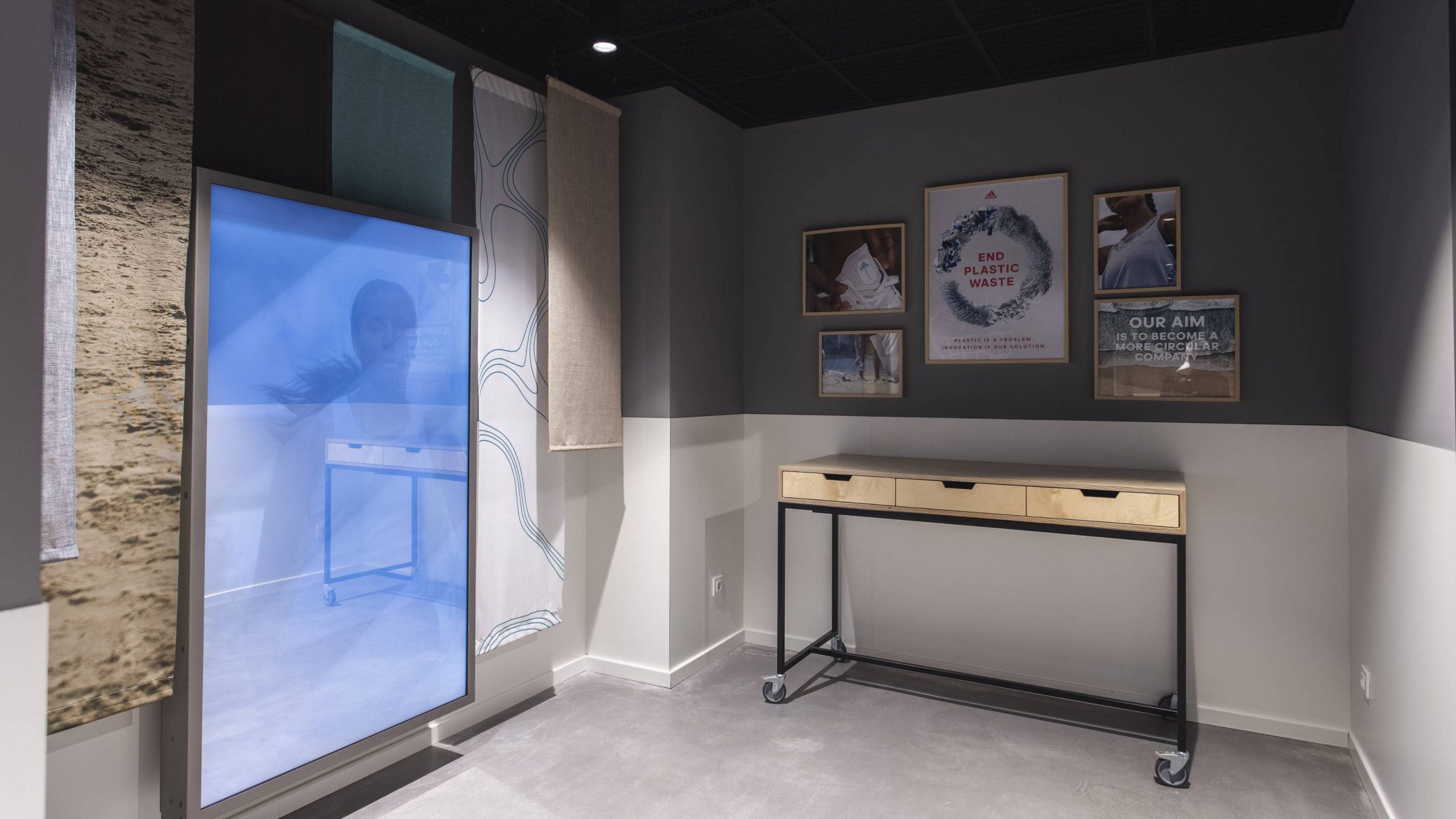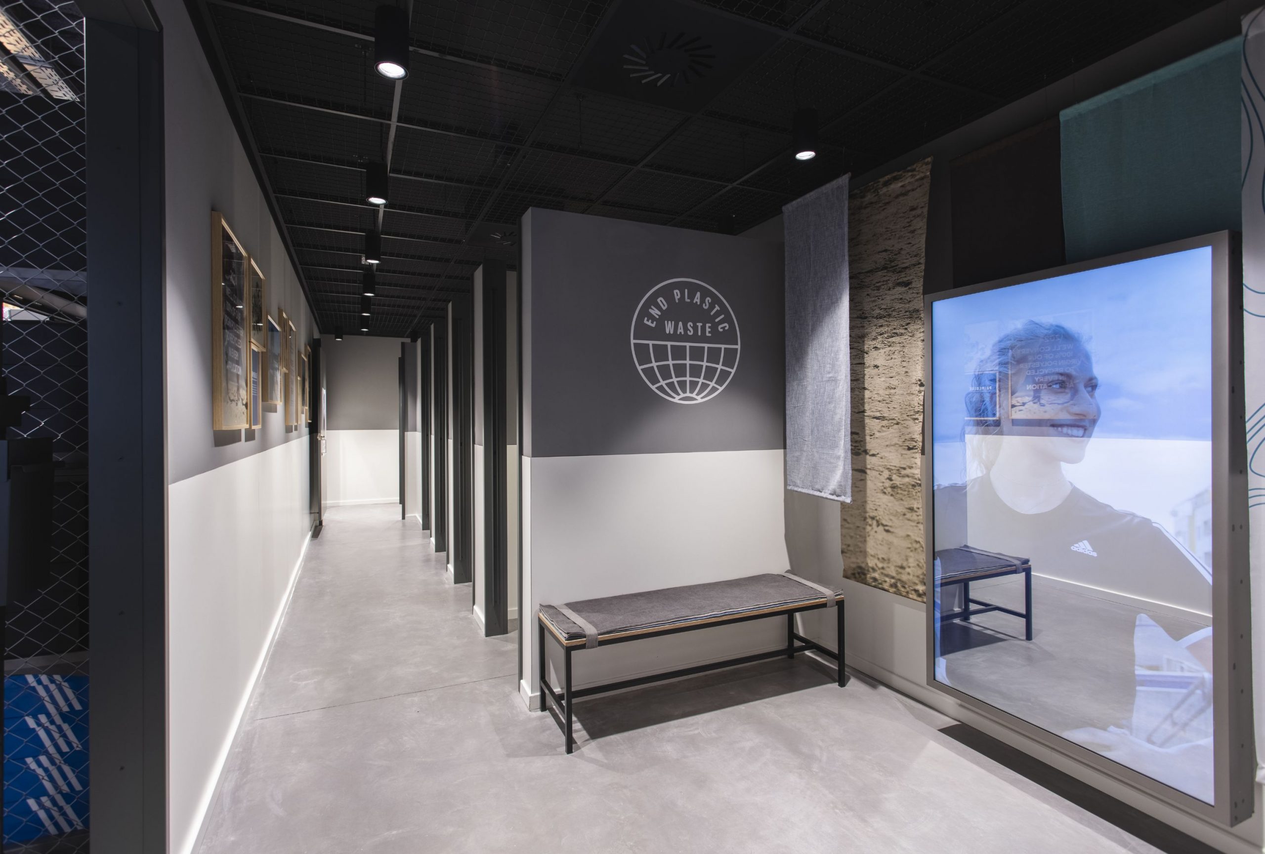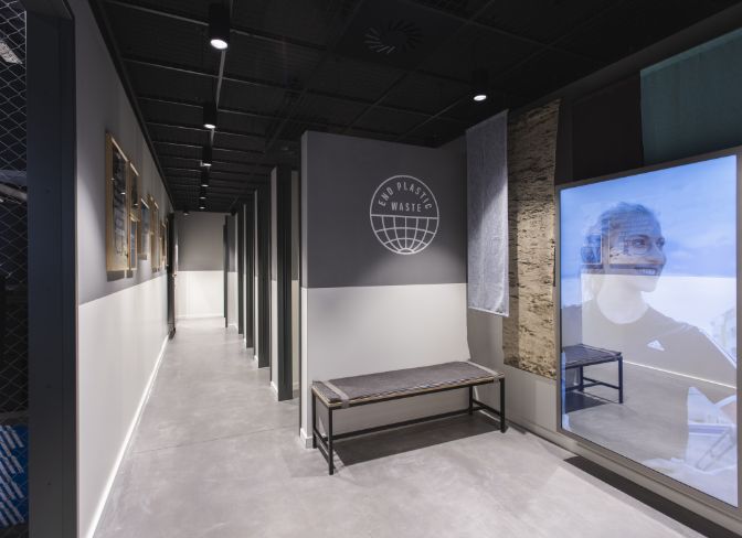 Para comunicar el compromiso de adidas con la reducción del uso de plásticos y el uso prioritario de plásticos reciclados dimos protagonismo «End plastic waste» con la instalación de unas gráficas que daban a conocer al usuario esta iniciativa de adidas. Vestimos la pared a través de tejidos naturales y materiales reutilizados.