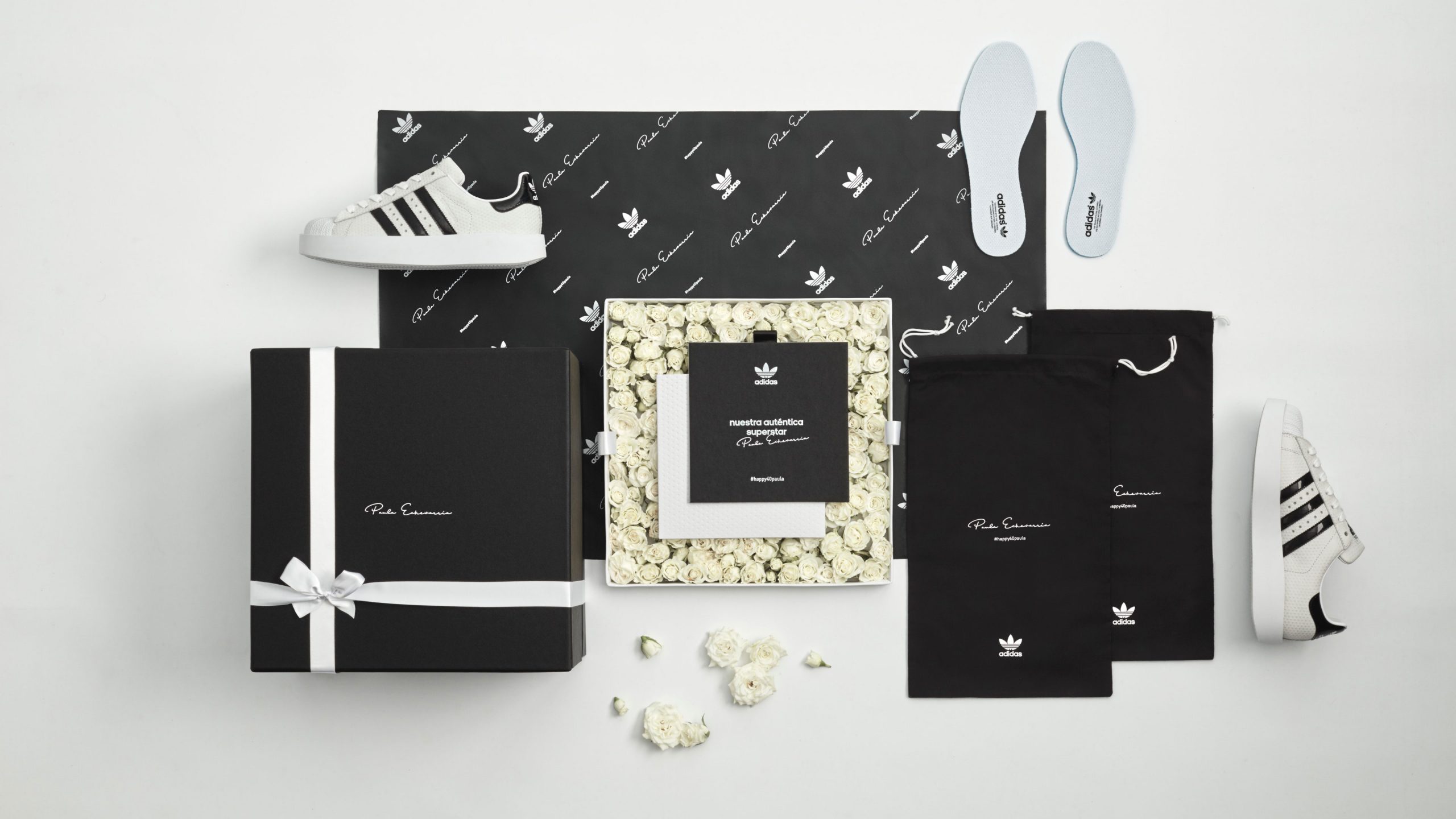 La marca de zapatillas Adidas, quería tener un detalle con la actriz e influencer Paula Echevarría con motivo de su 40 cumpleaños. Para empezar esta nueva etapa con buen pie, diseñamos un packaging personalizado donde incluimos un par de sus zapatillas fav, entre otras sorpresas.