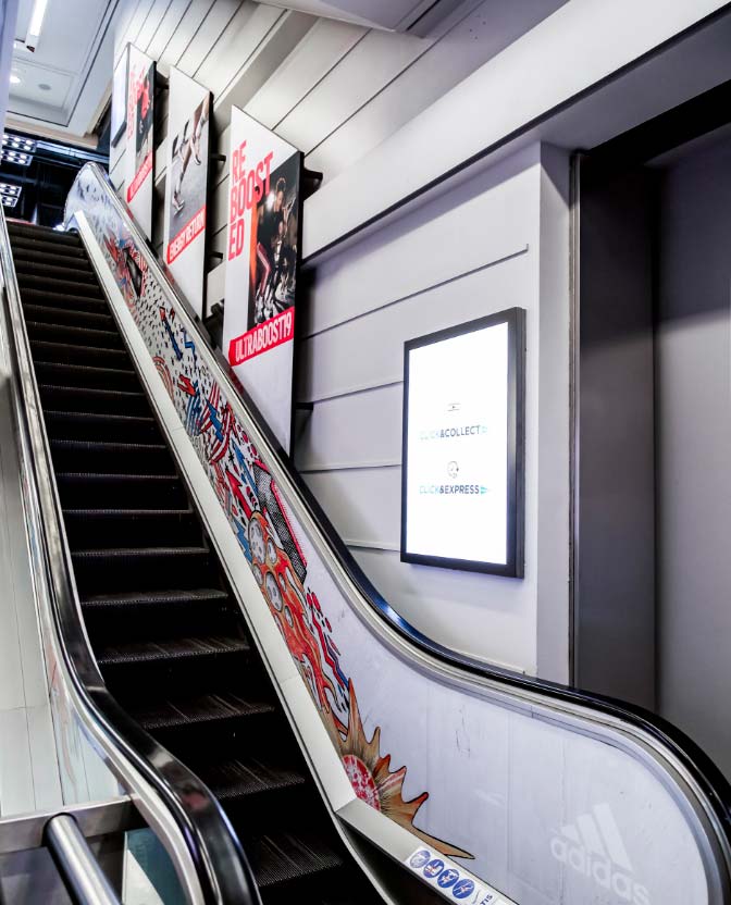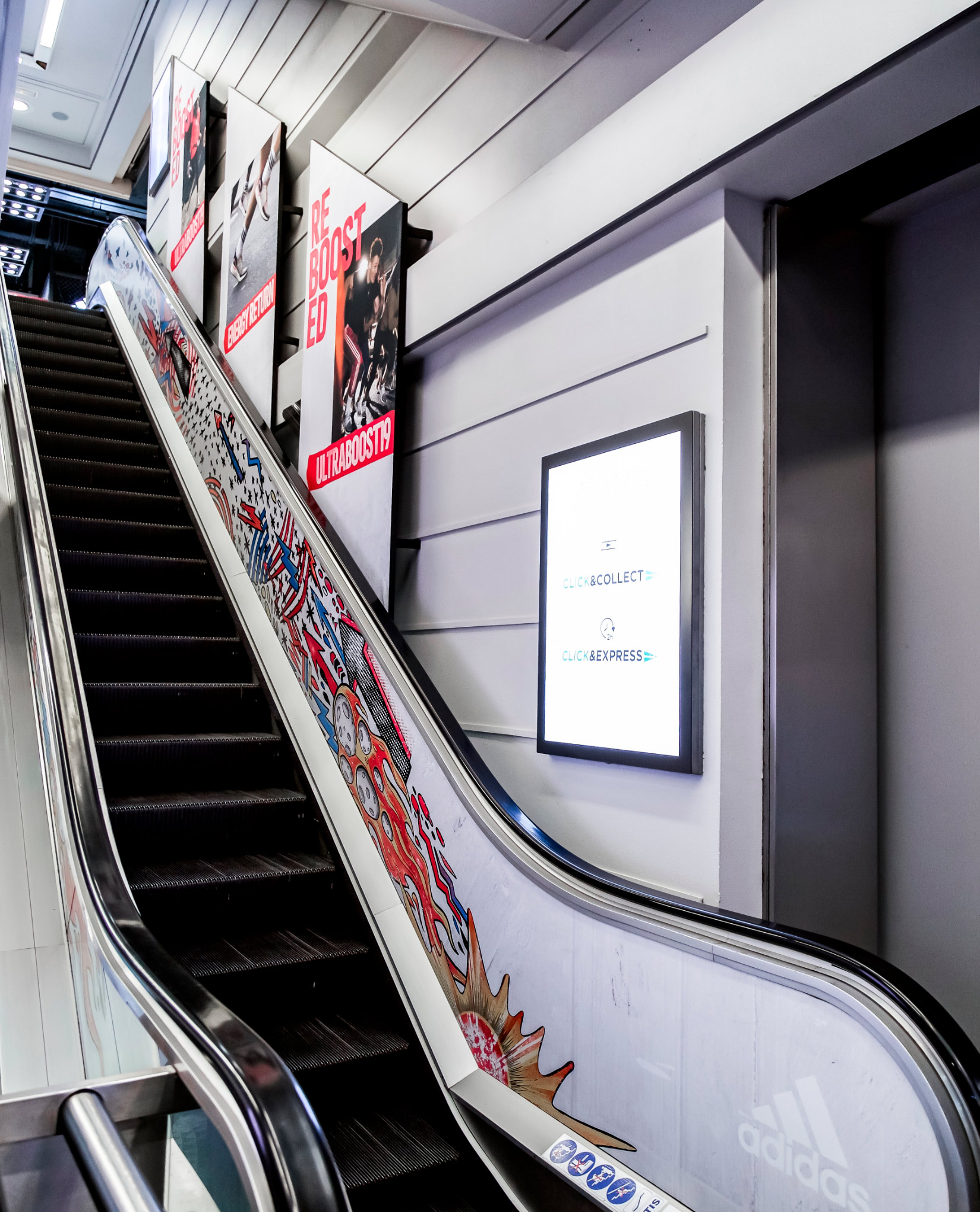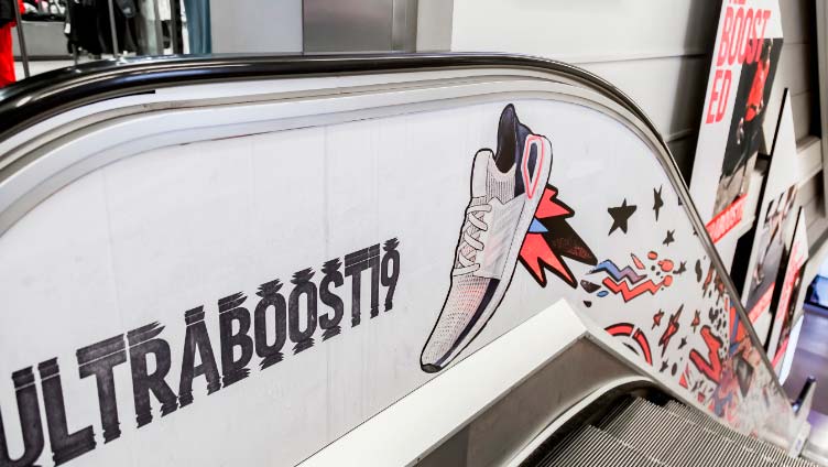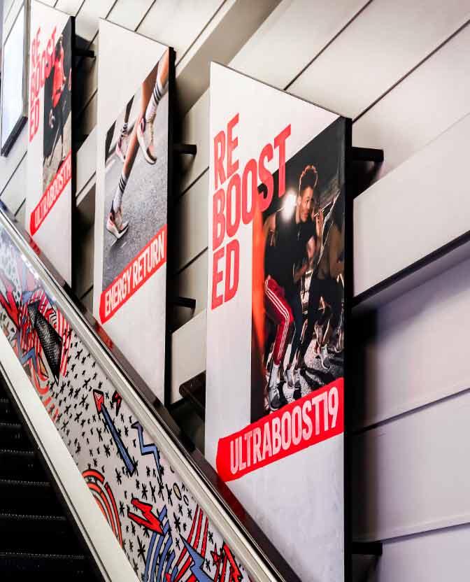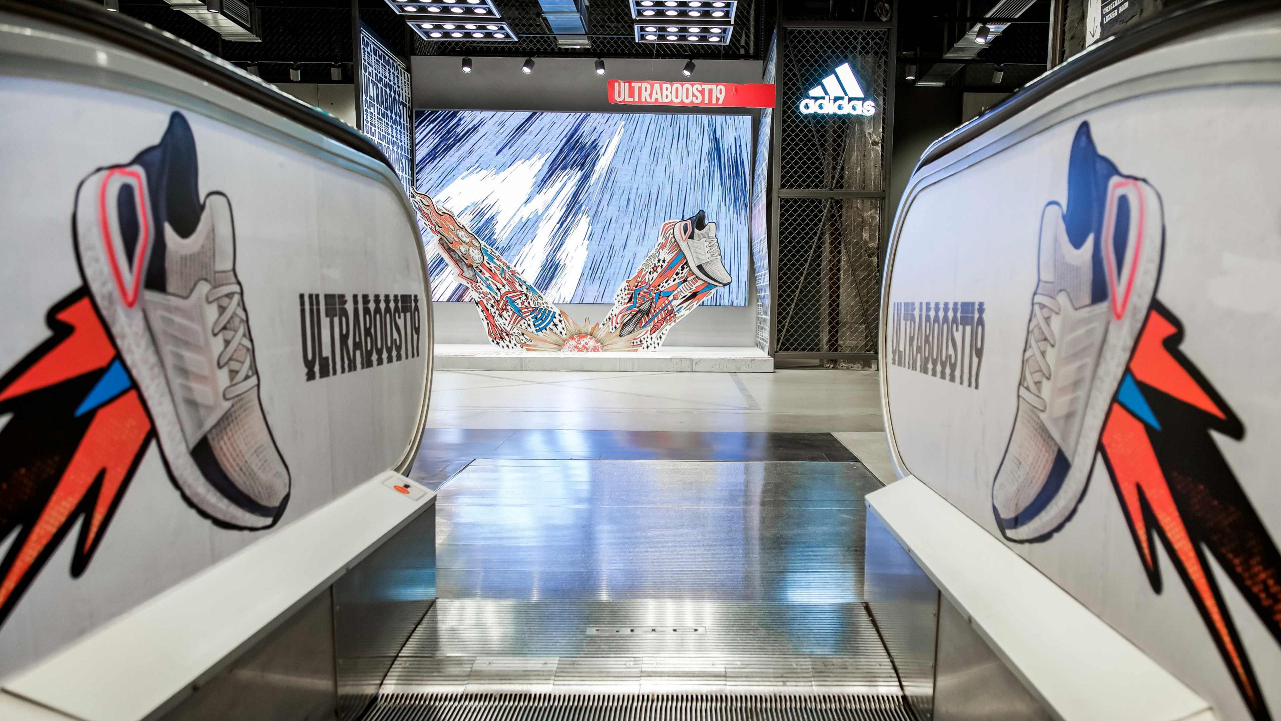 Combinando colores, materiales, tipografía e ilustraciones, conseguimos crear una experiencia desde la zona de acceso, hasta la instalación. Una forma llamativa de hacerte sentir dentro del universo Ultraboost.