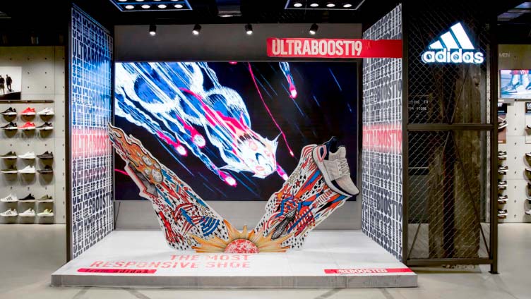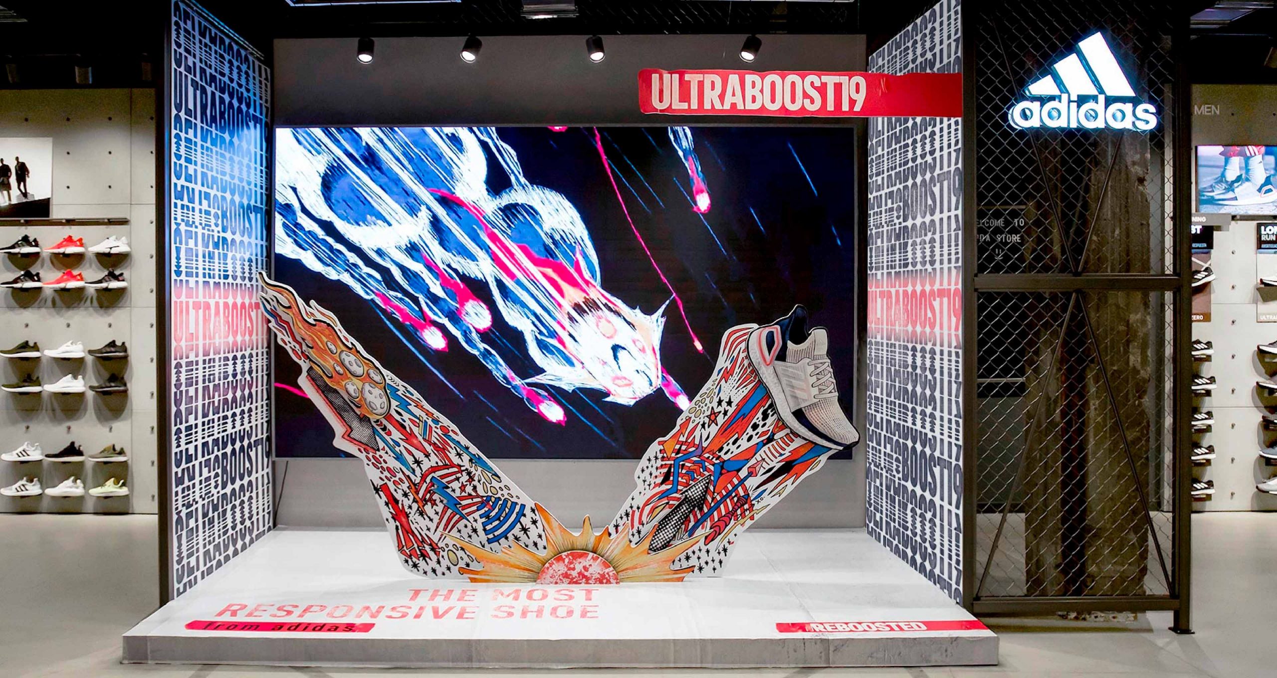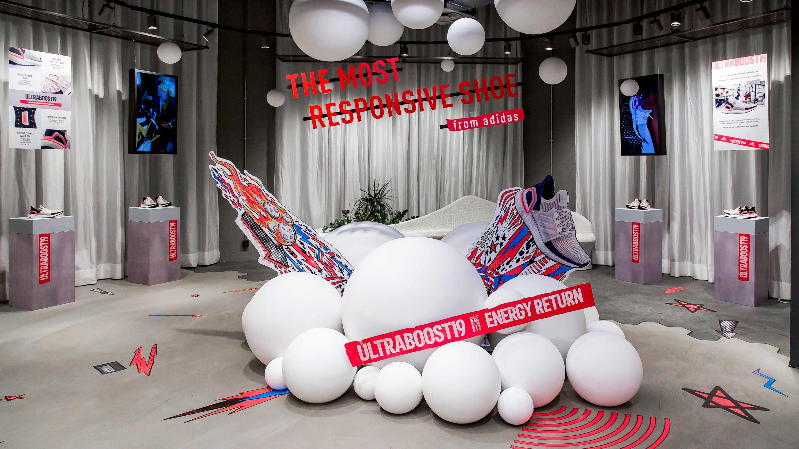 Ultraboost 19 es la reinvención del running. Esta zapatilla garantiza una comodidad y retorno de energía inigualables gracias a su tecnología BOOST incorporada en la suela. Sus cápsulas esféricas nos sirvieron de inspiración en el diseño del espacio expositivo, así como la zona de acceso.