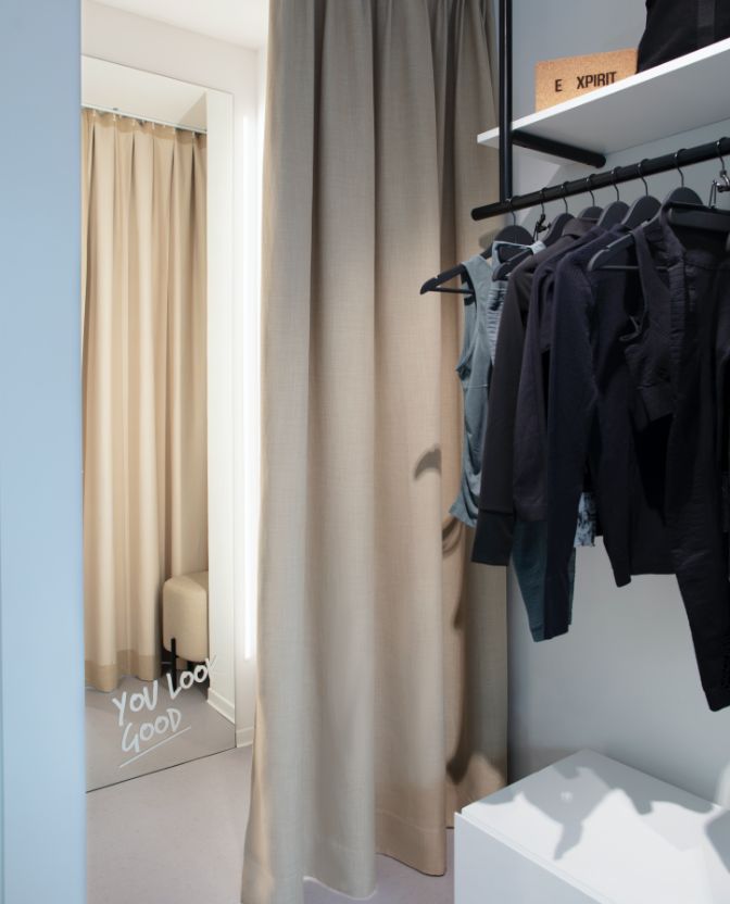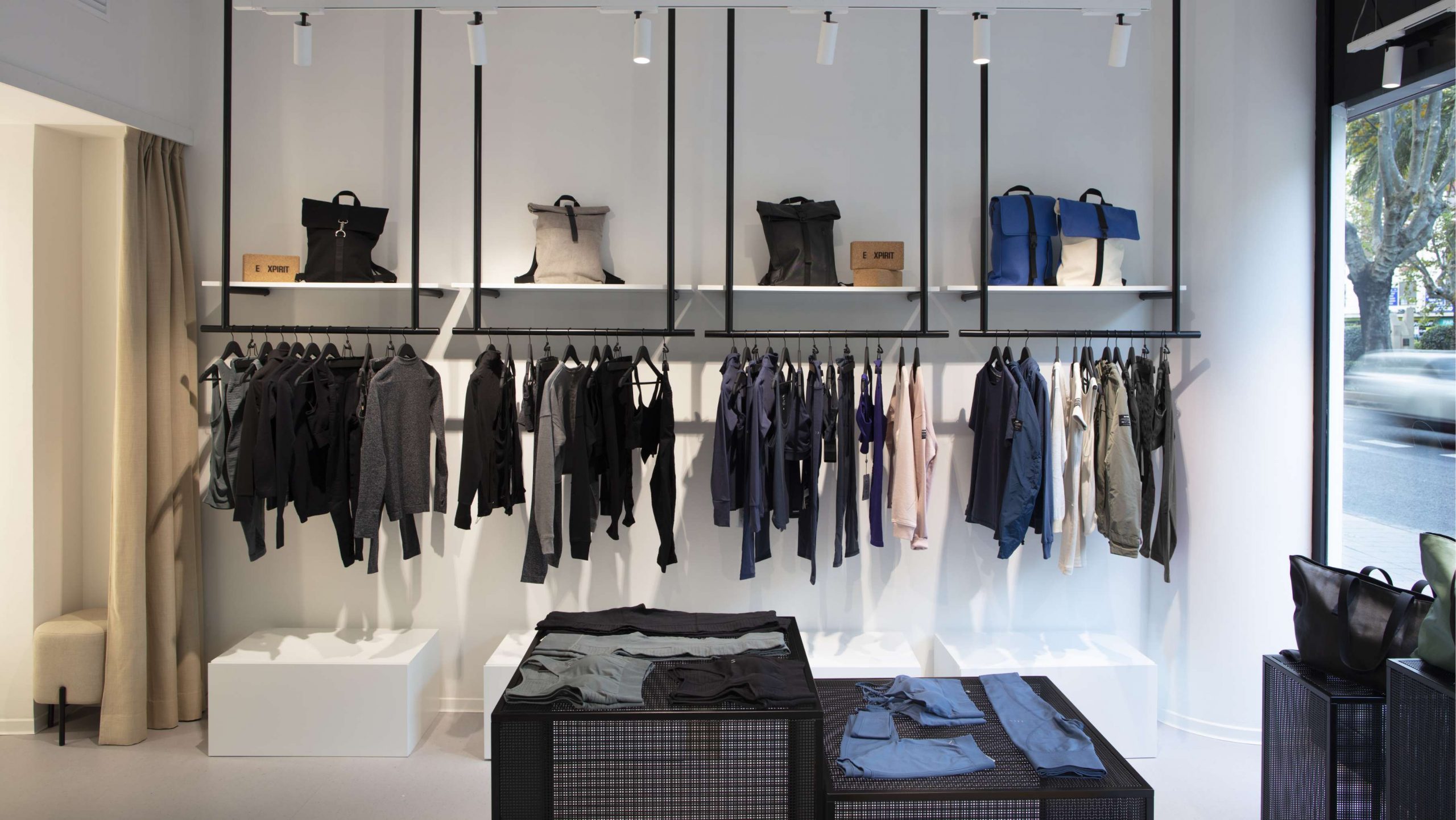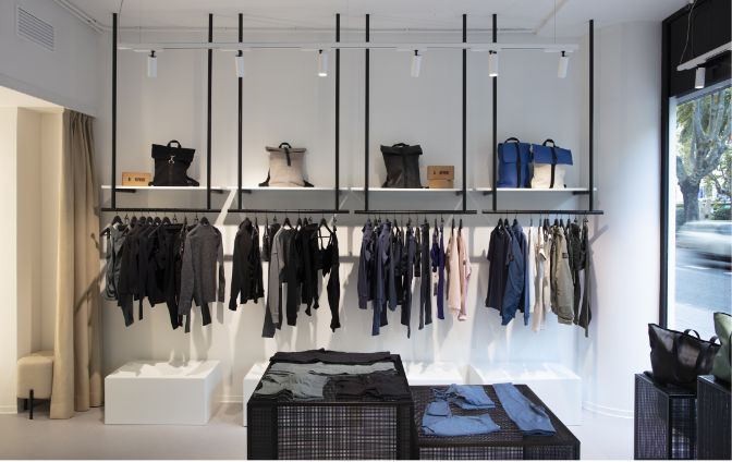 Accedemos desde la boutique, donde encontramos diferentes soportes de exposición del producto. Podios de diferentes alturas, acompañados de módulos donde colgar prendas y almacenar el stock.