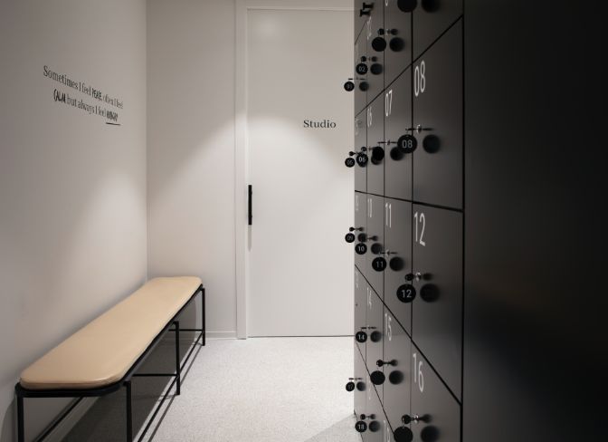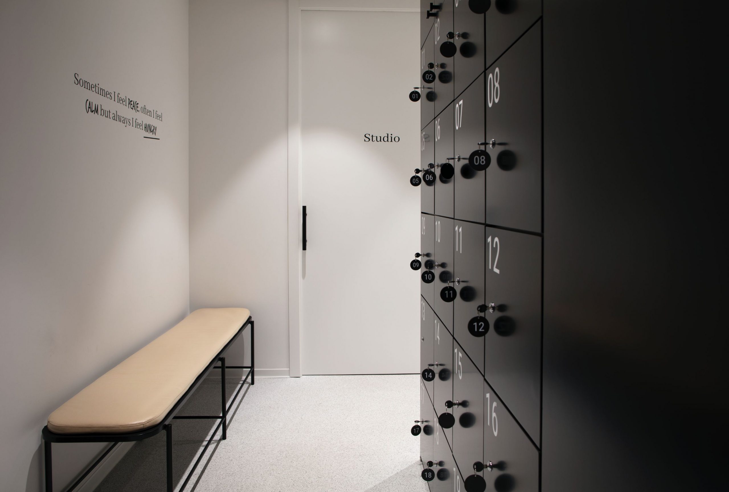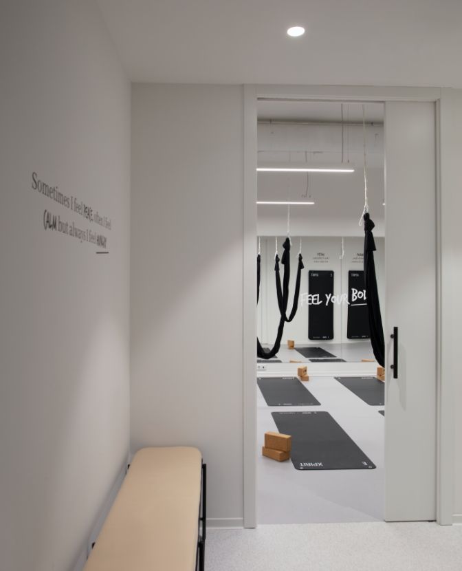 A través de una puerta corredera se accede al Studio, sus cortinas dan presencia y crean un ambiente de relax, gracias a su gran capacidad de reducir la entrada de luz natural al mínimo. Además la sala cuenta con una instalación de iluminación regulable, adaptando su intensidad al mood de cada disciplina.