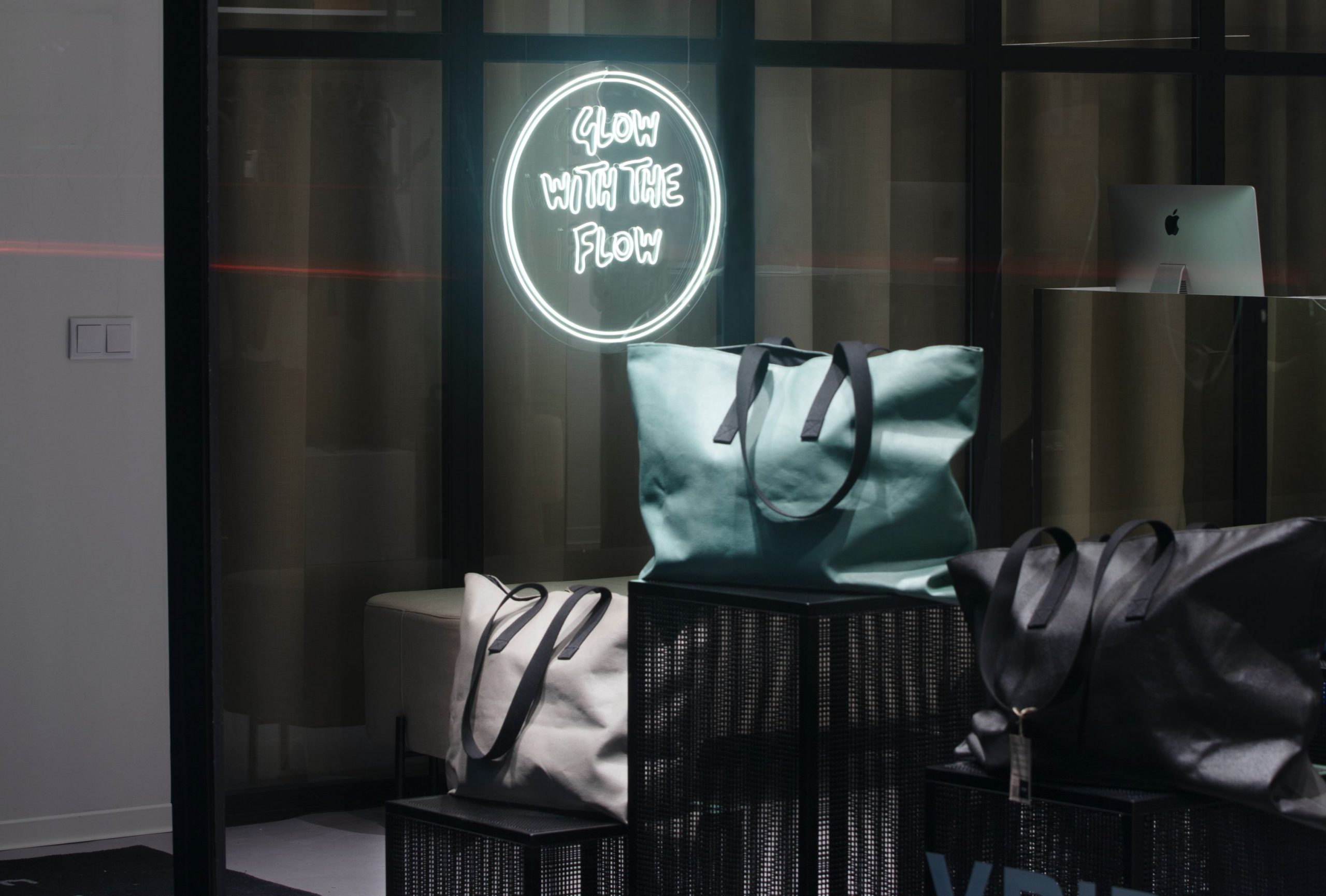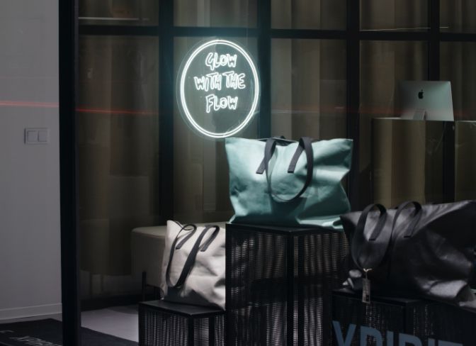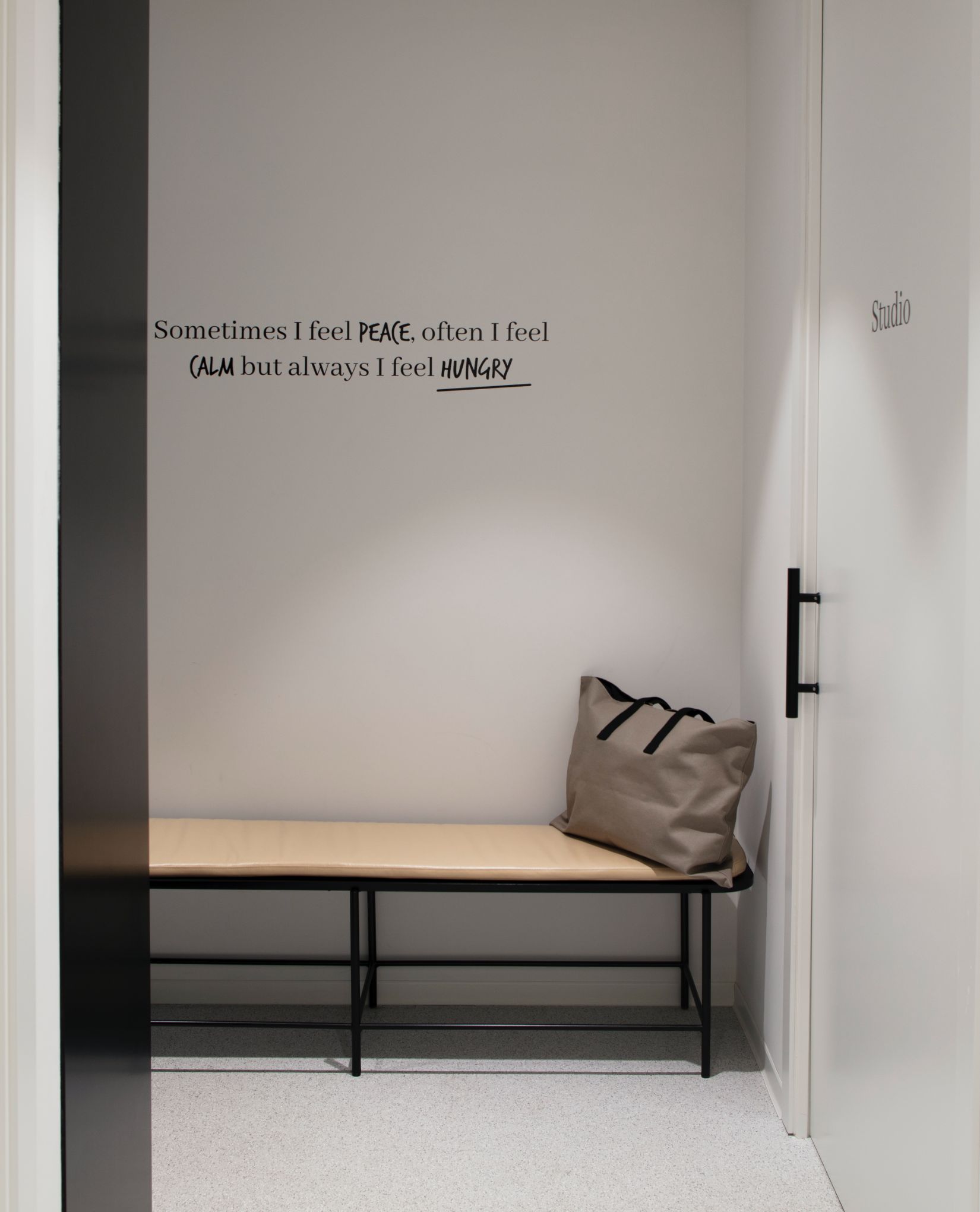 Siguiendo la línea del escaparate, encontramos una partición de vidrio combinada con perfilería metálica de color negro que descubre la zona del Studio, aportando elegancia y ligereza. A su lado, un banco encabezado por un rótulo luminoso da la bienvenida a sus clientes. El photo corner perfecto para compartir en redes.