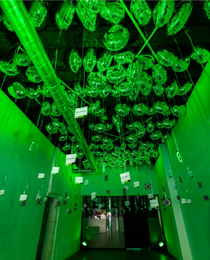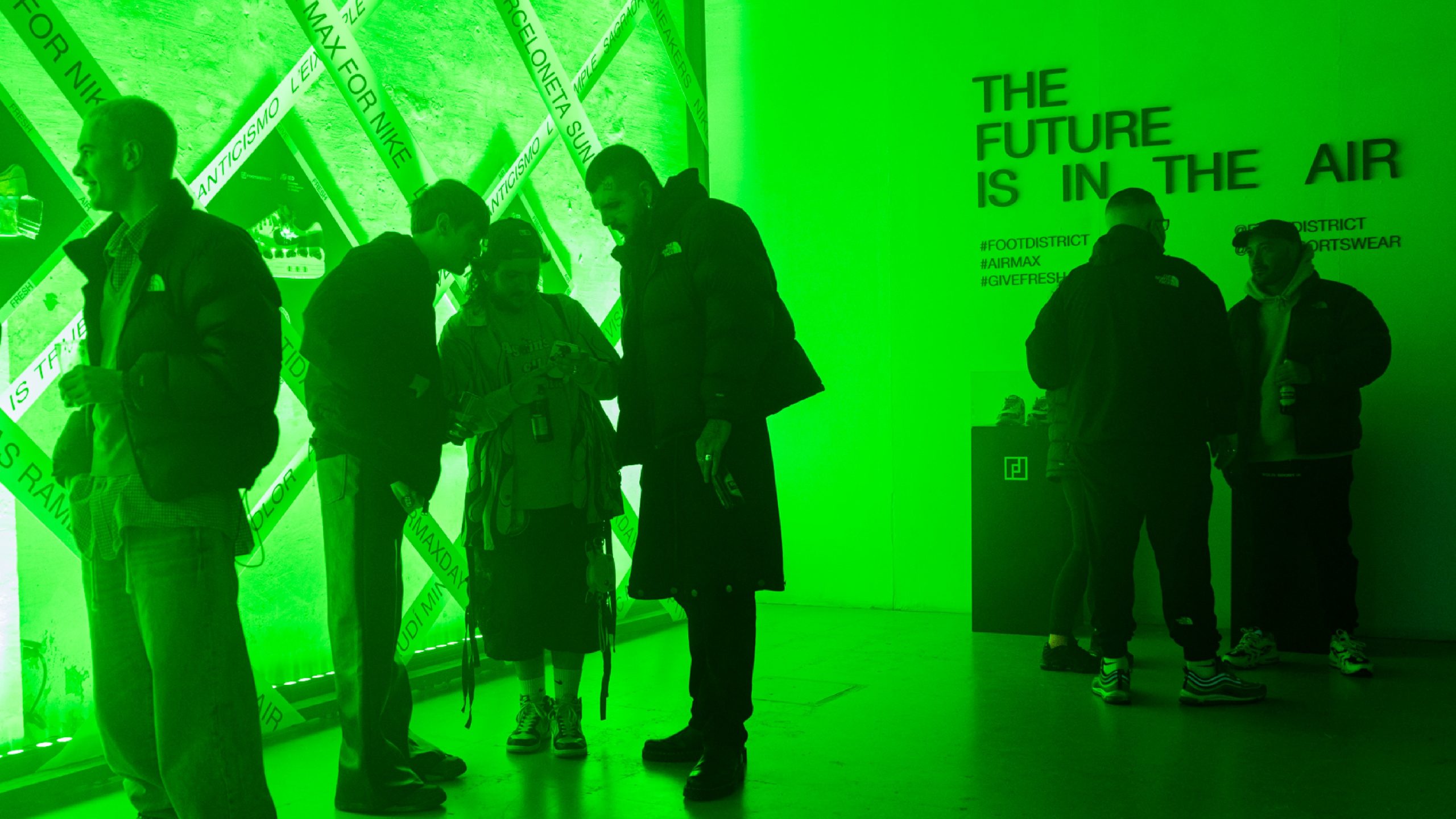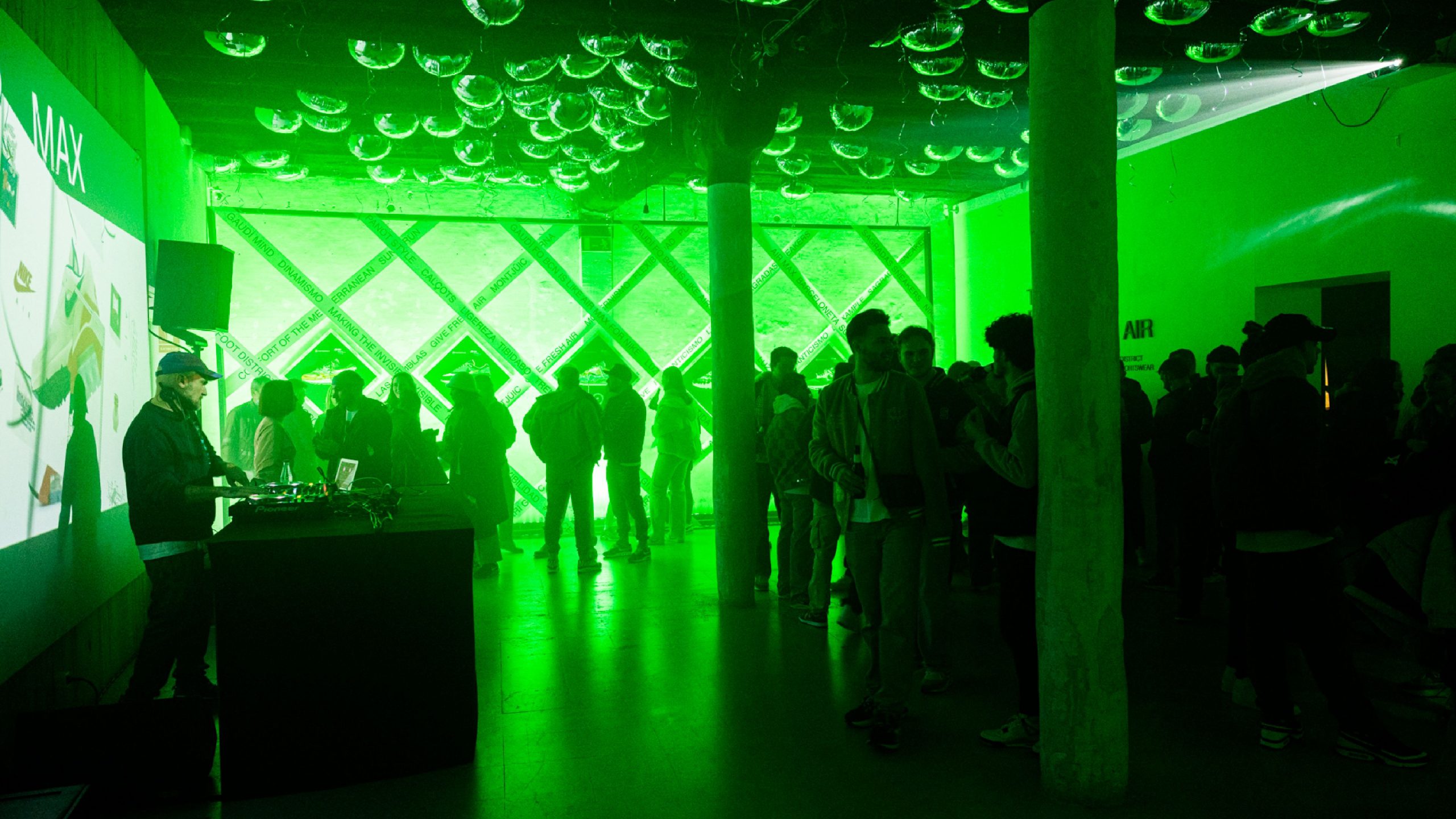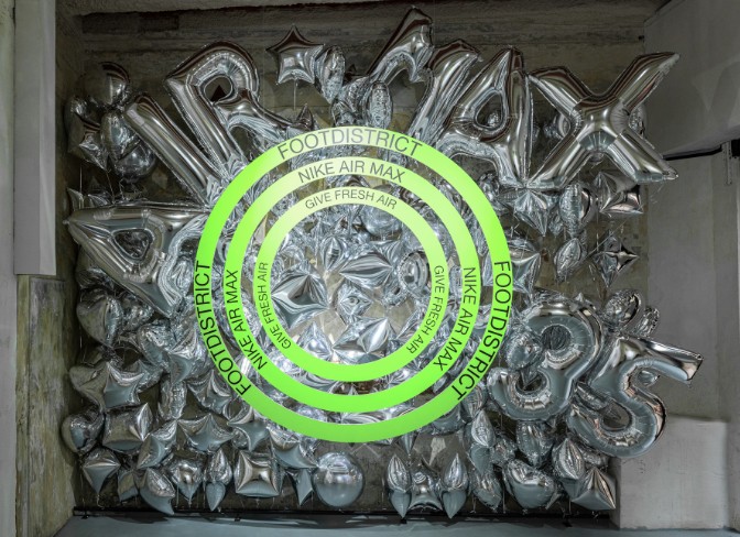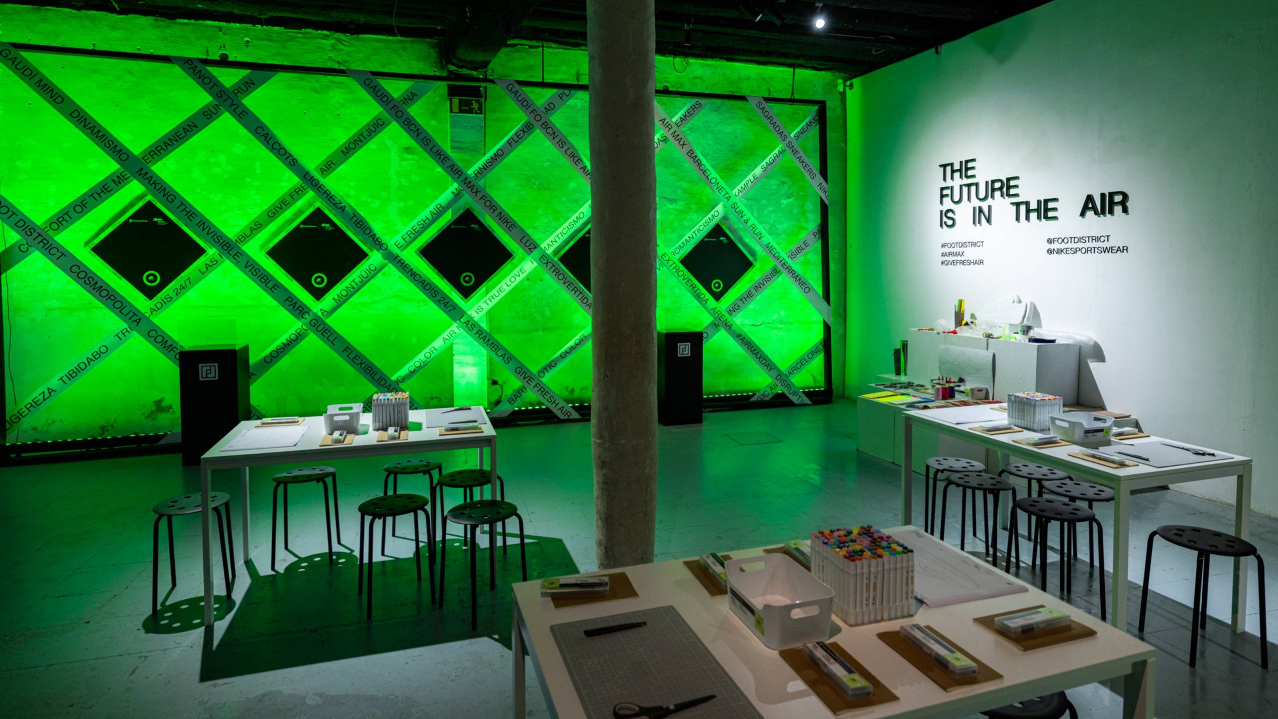 La sala interior, lugar en el que se realizaría el taller y la fiesta, unas cintas e hinchables representaban gráficamente elementos reconocibles de la ciudad de Barcelona, la marca y Footdistrict.