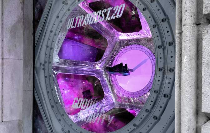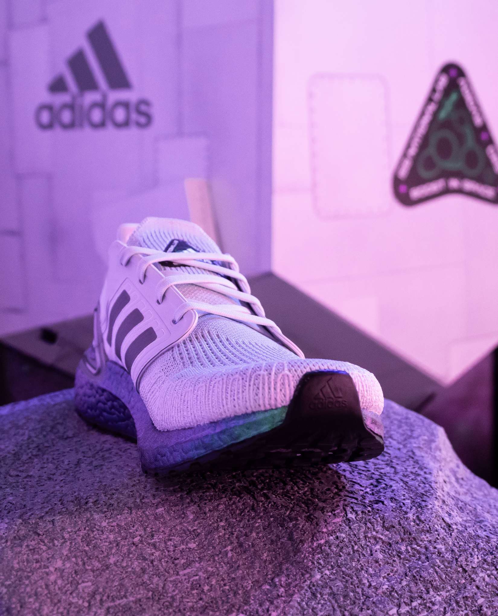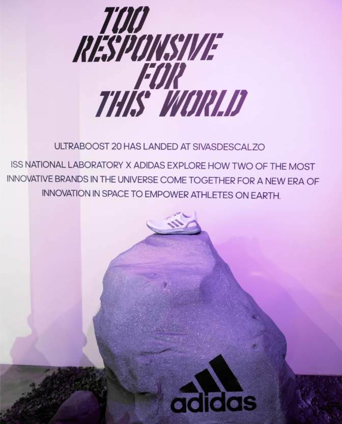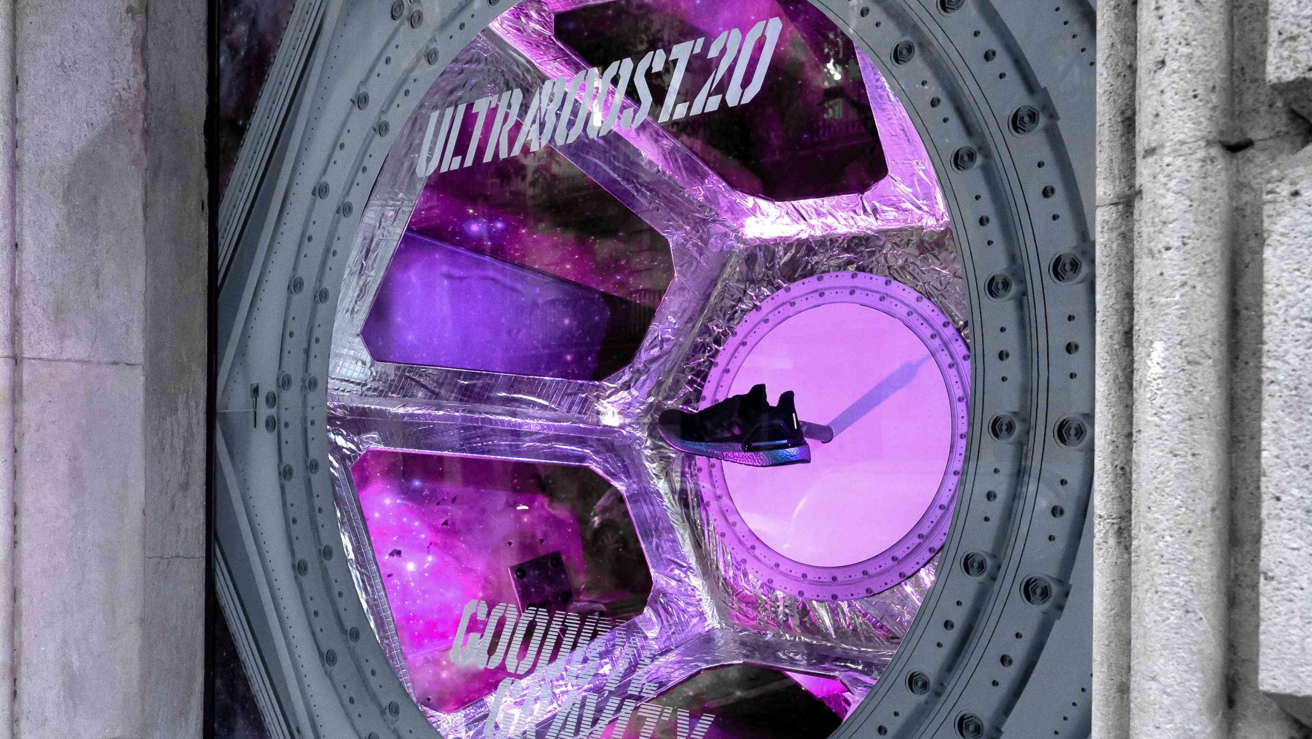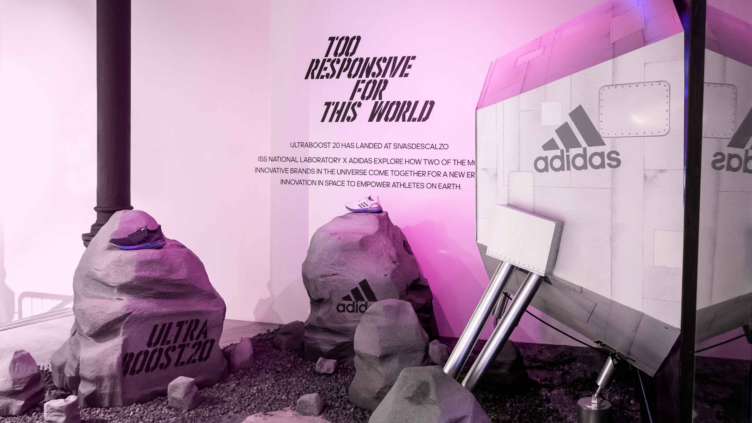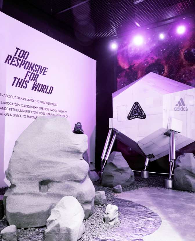 En el interior escenificamos el aterrizaje de la nave espacial en un planeta rocoso y desconocido en el que nacía la nueva Ultraboost 20.