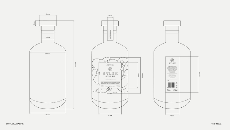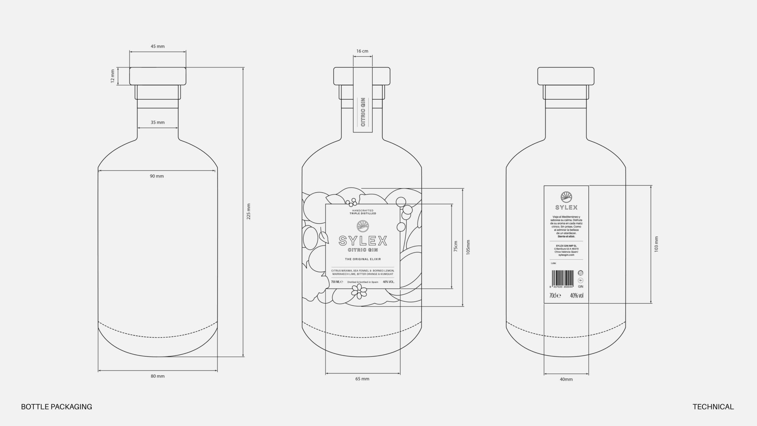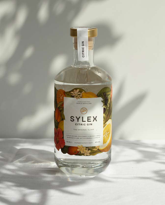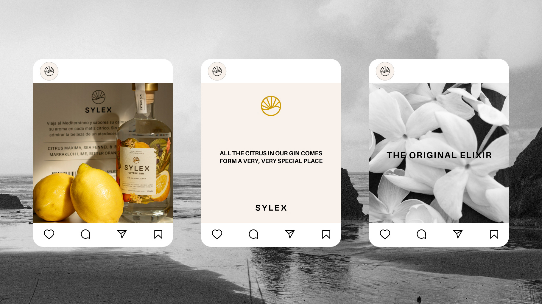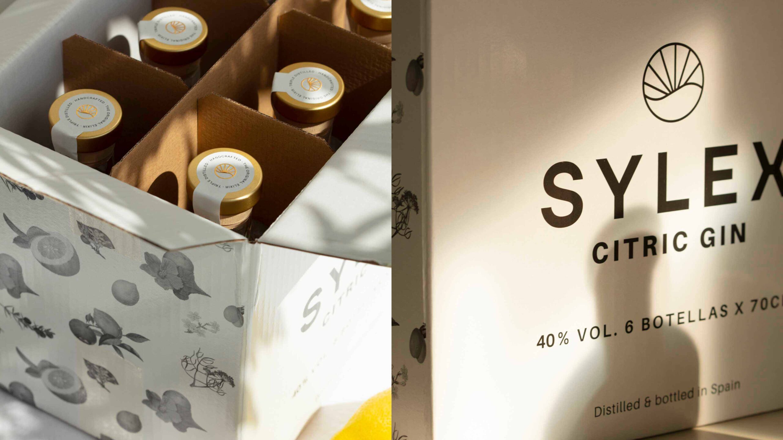 Texturas granuladas como la arena, destellos dorados como el sol al atardecer. Conceptualizamos cada pieza para transmitir la esencia y filosofía de marca de SYLEX GIN tanto por fuera como por dentro.