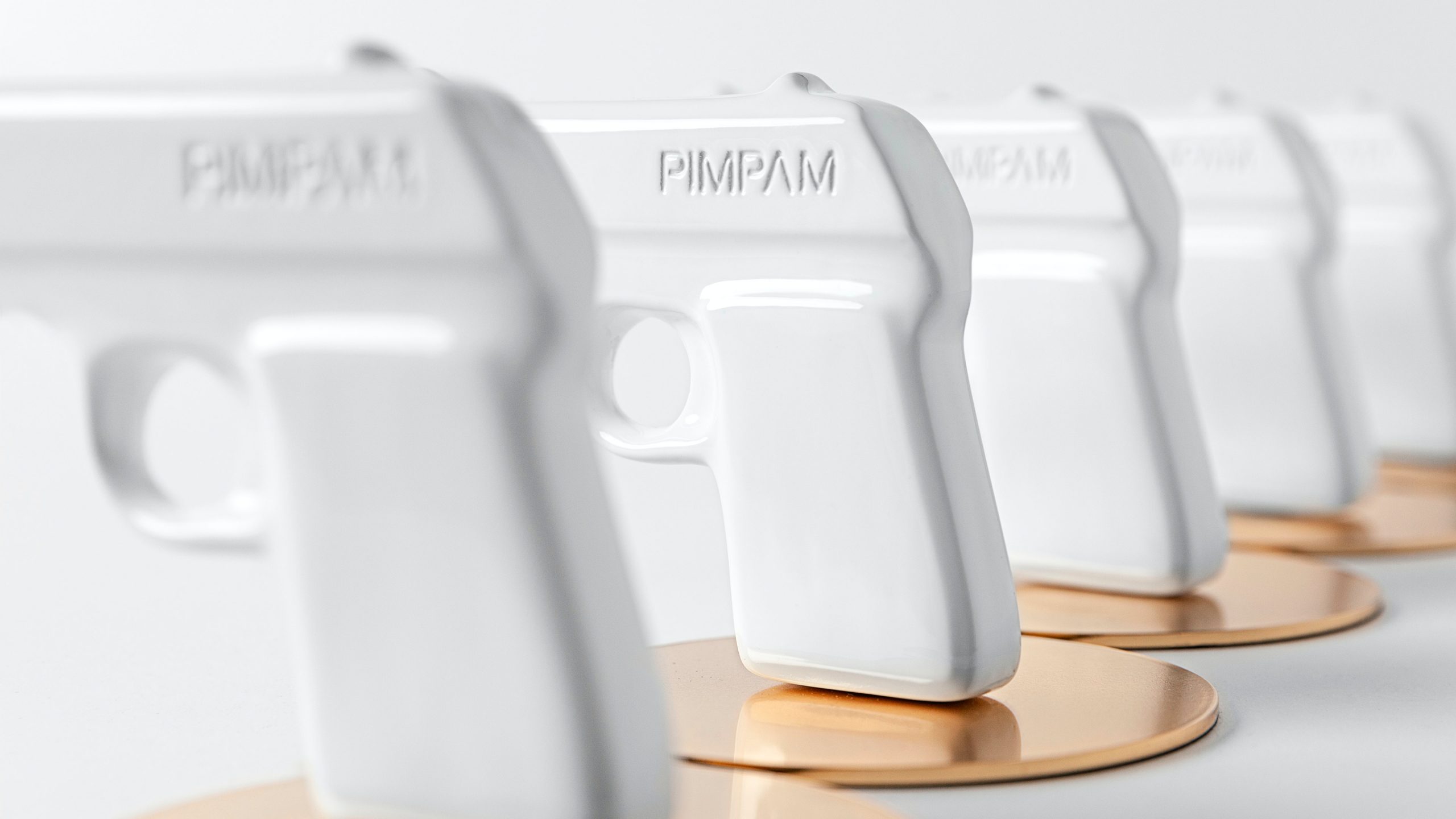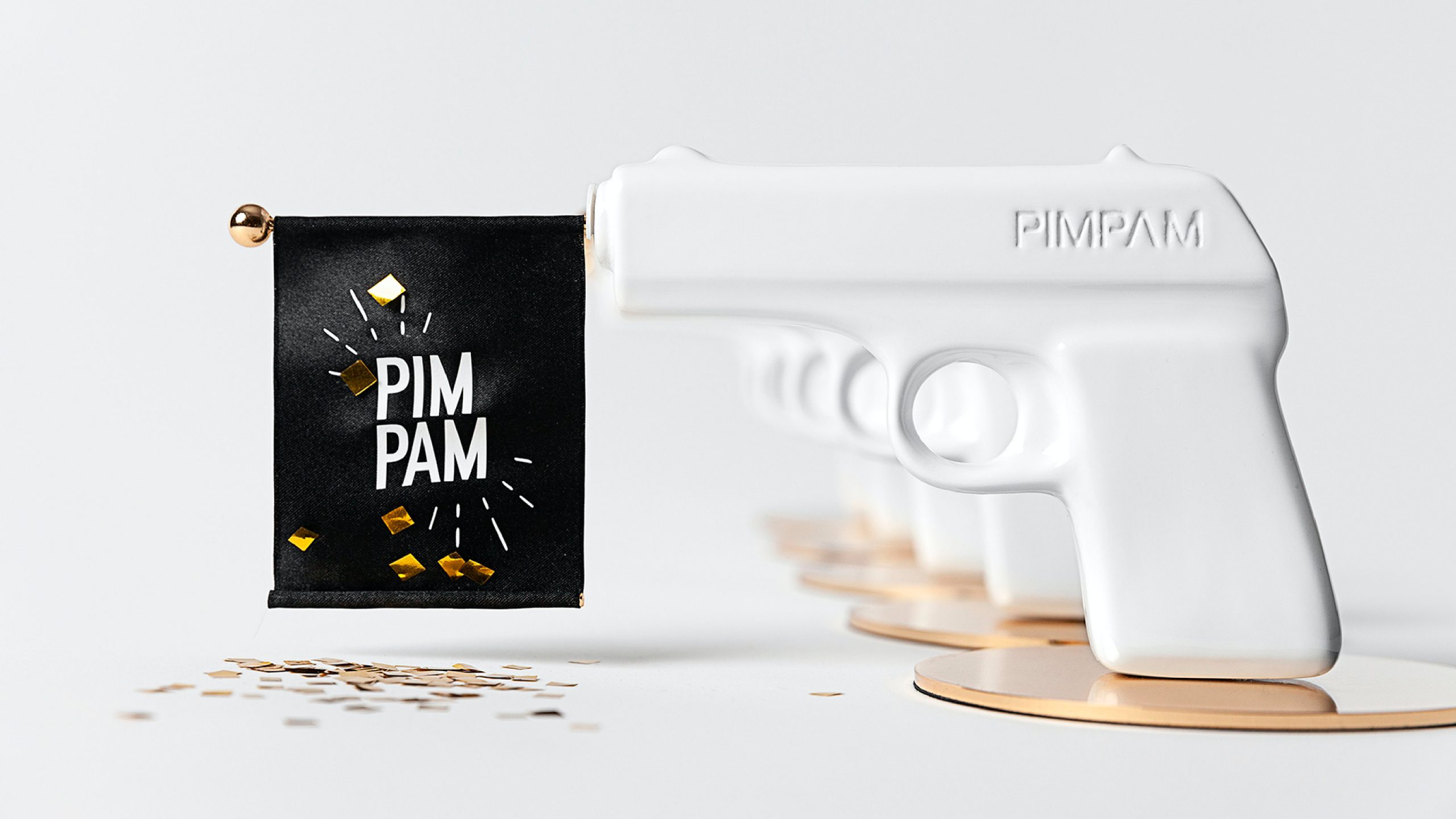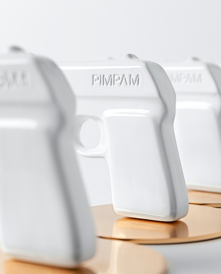 Junto a un ceramista, diseñamos y produjimos una pistola de porcelana blanca que, “al disparar” liberaba una bandera con nuestro logo en una explosión de confeti dorado.