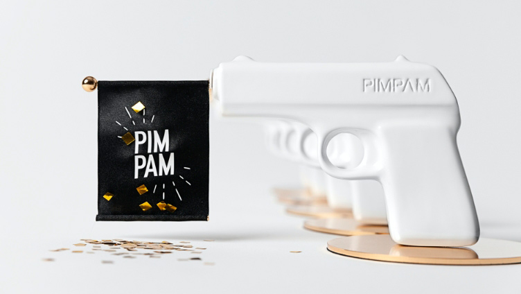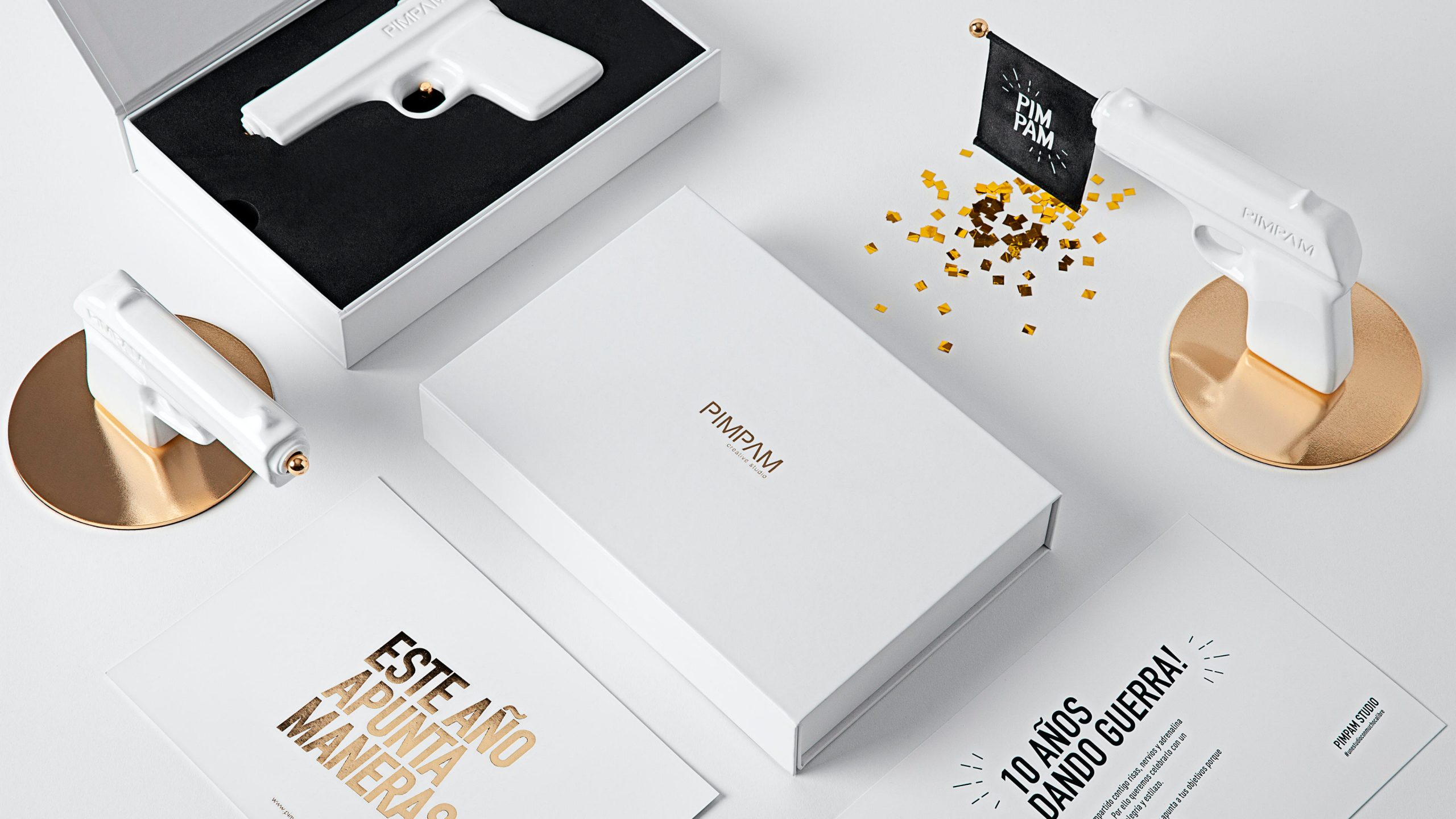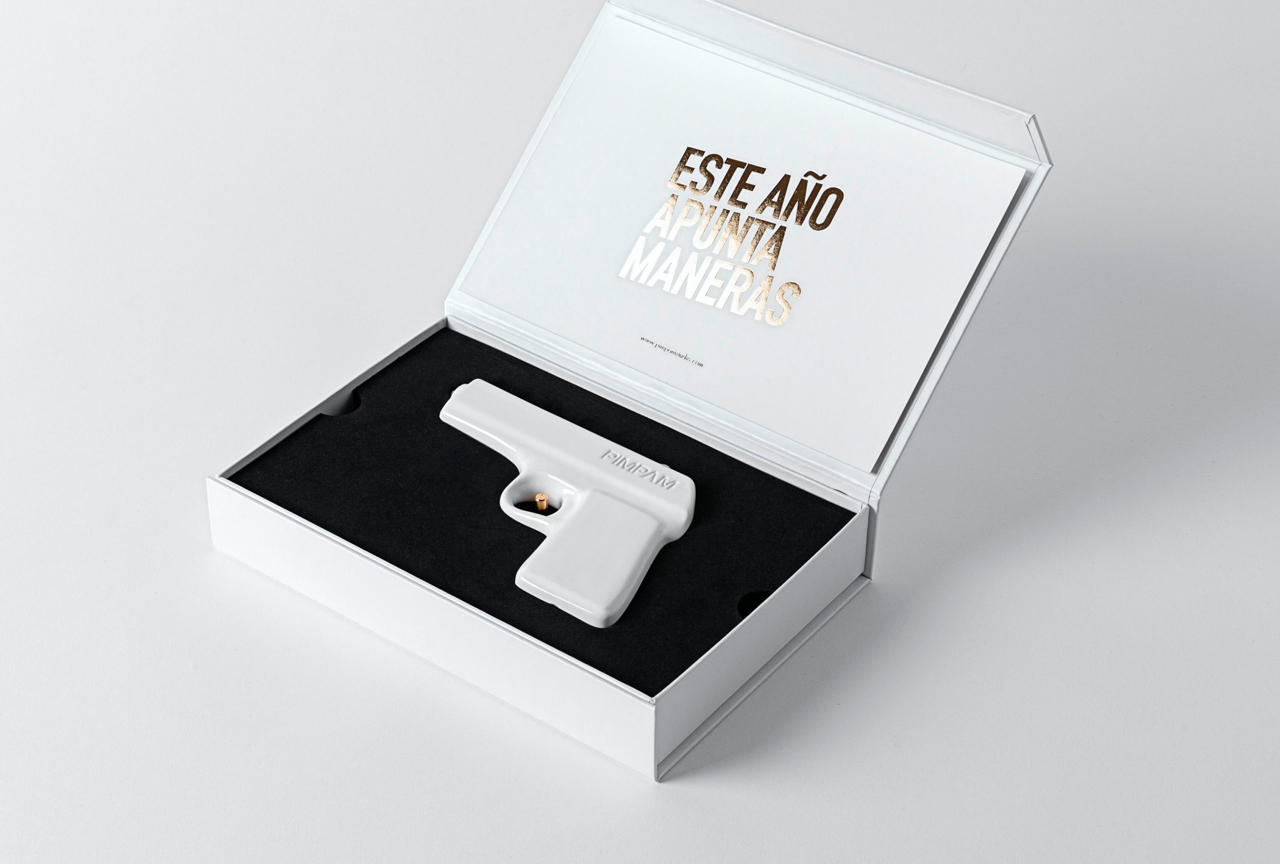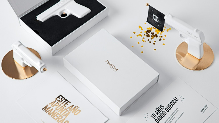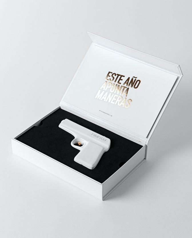 Nos encanta felicitar la navidad a nuestros clientes con un regalo muy especial. Y para celebrar nuestros 10 años dando guerra debíamos pensar en una pieza de mucho calibre. Siendo Pimpam y bajo el concepto “Este año apunta maneras!” creamos una pistola que disparaba sorpresa, humor y buen rollo para el próximo año.